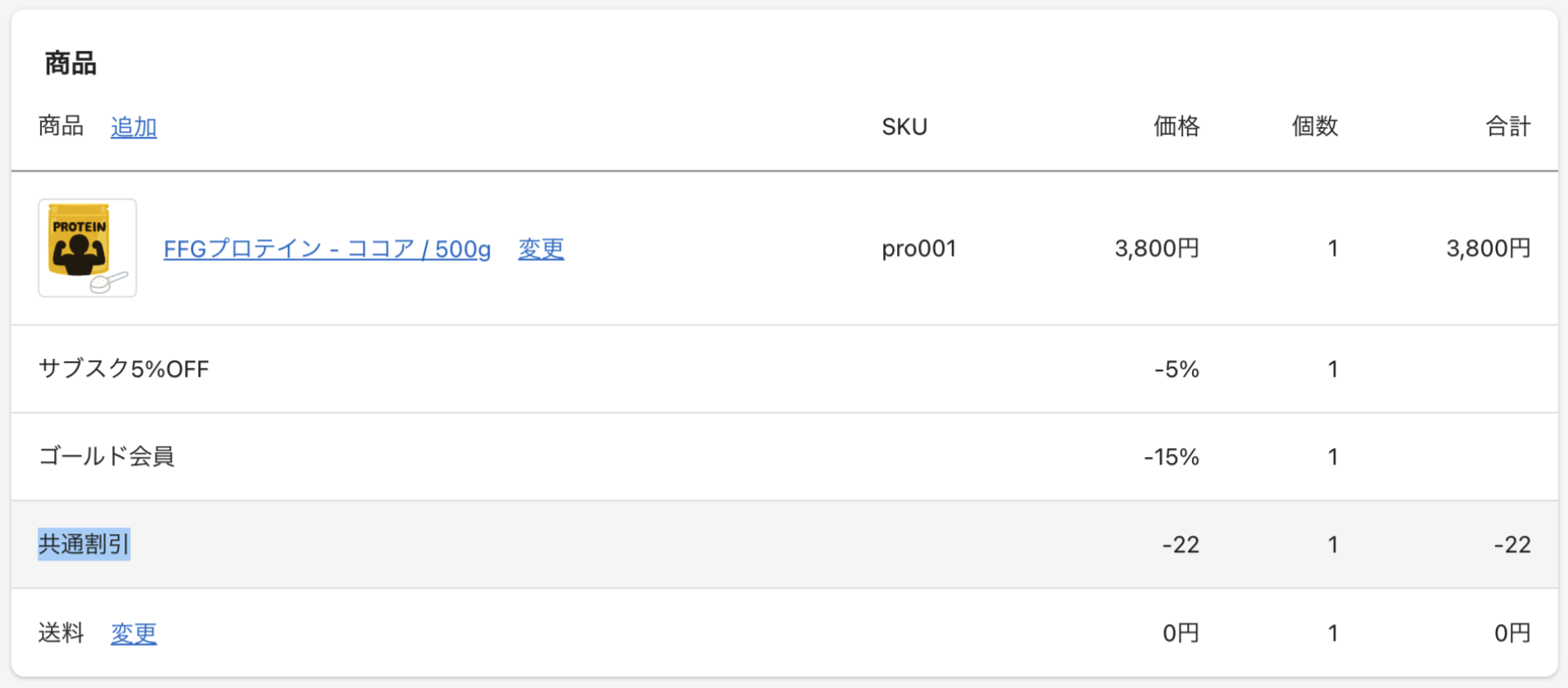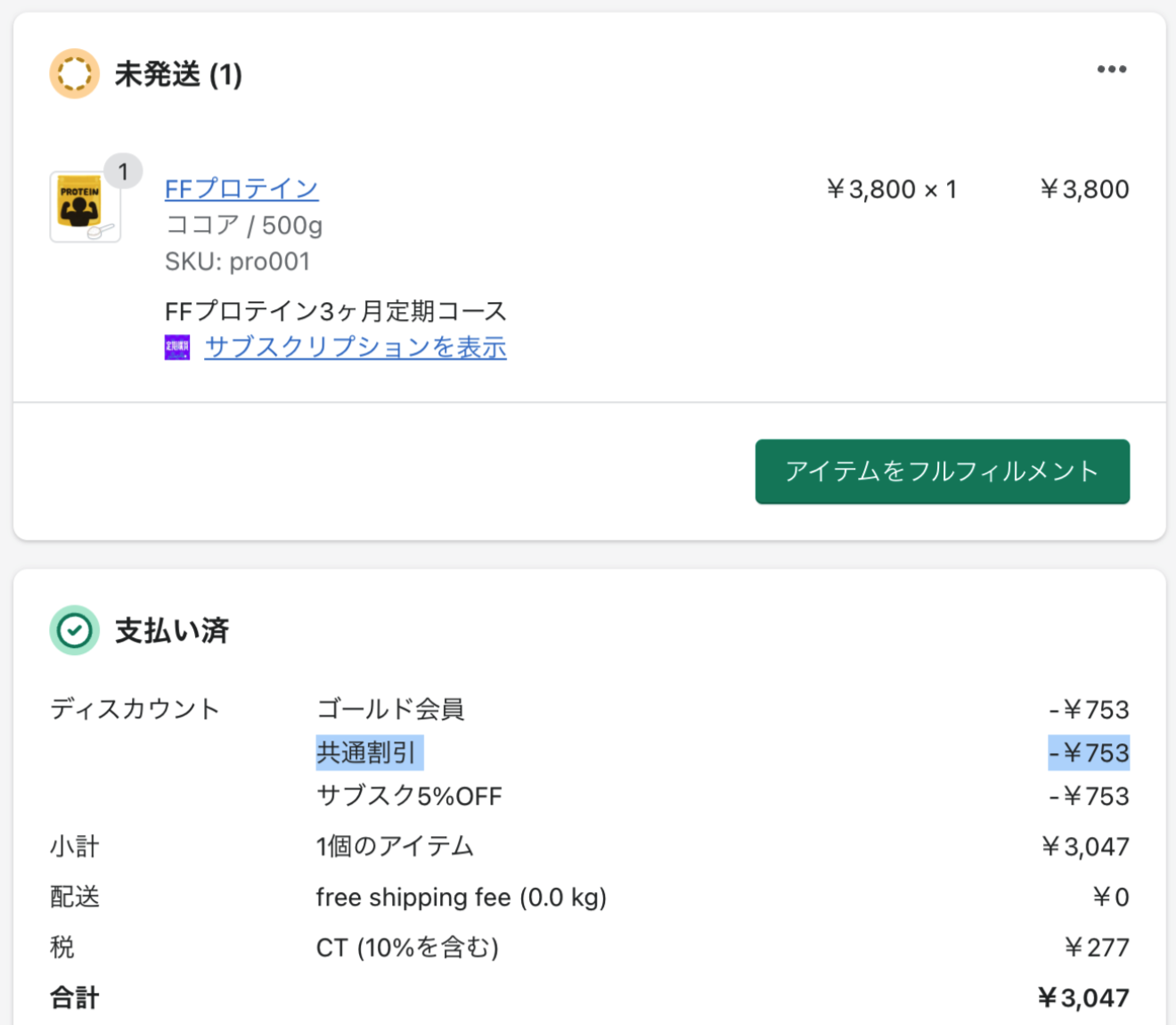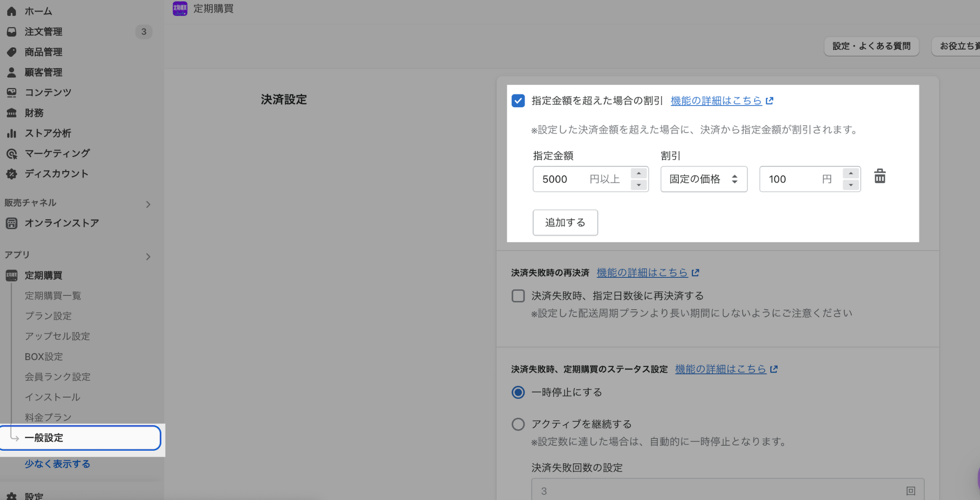 「定期購買契約の商品金額の合計 + 送料」が、「指定金額」以上の場合、設定した割引内容が定期決済時に適用される機能です。 (指定金額の条件に複数マッチするものがあれば、割引金額が一番大きいものが優先適用されます) 割引が適用されると、定期購買契約、注文管理に「共通割引」が表示されます。