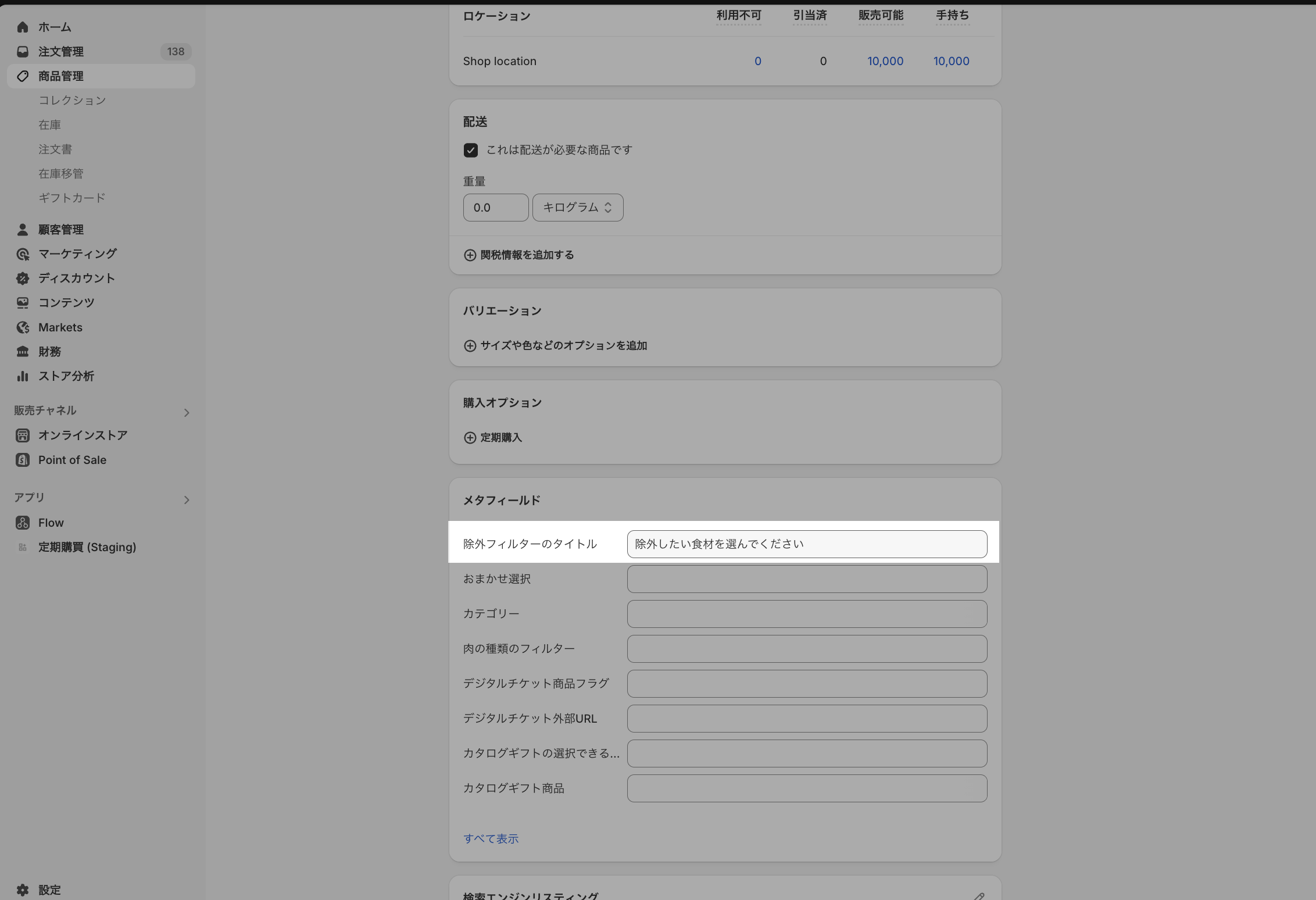 1-3. Shopify管理画面の商品管理より、商品のページを開き、除外フィルタータイトルにタイトルを入力します
