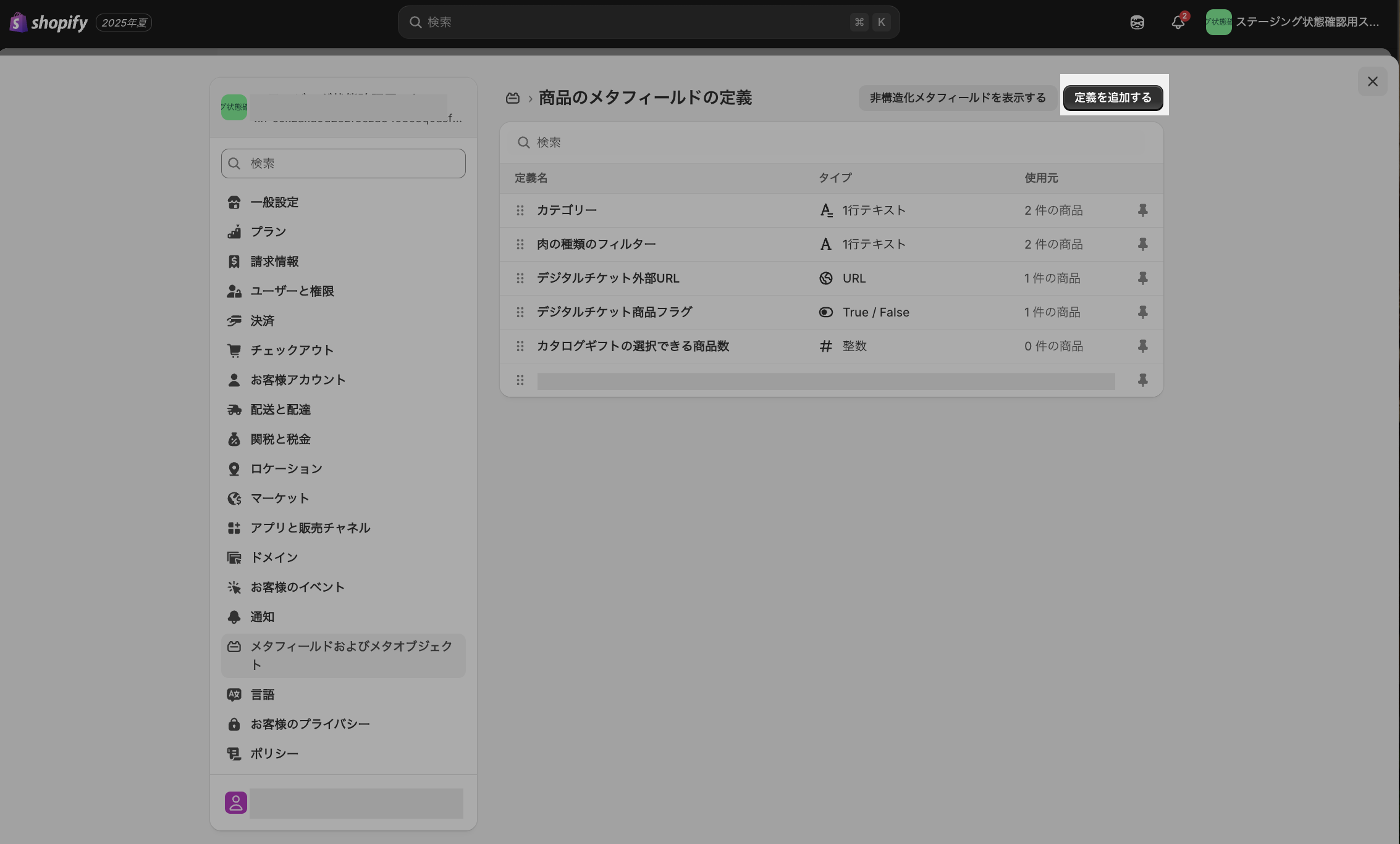 1. Shopify管理画面の設定メタフィールドとメタオブジェクト商品にアクセスし、新しい定義を追加します。
