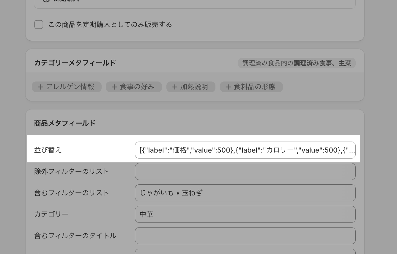 1. 該当商品のメタフィールド「並び替え」欄へ、2で生成したJSONを入力し保存する