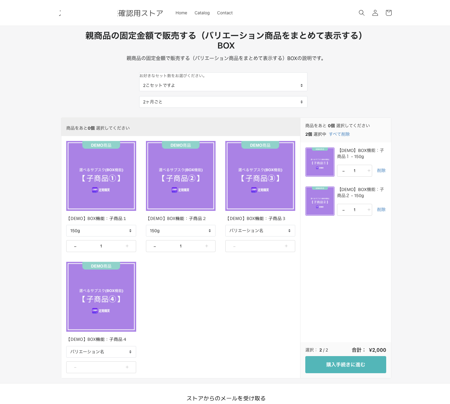 新しいお客様アカウントを利用中の店舗様へ ※現在、新しいお客様アカウント用マイページには新BOX機能が未対応のため、新しいお客様アカウントを利用中の店舗様は旧BOX機能をご利用ください。対応については順次進めております。 本ページの設定でできるようになること こちらのページの設定を行うことで、商品は下記の状態となります。 - お客様自身が好きな商品を組み合わせることが可能 - 子商品の合計金額で販売 - バリエーション商品をまとめて表示(セレクトボックスから選択可能) ※バリエーションを個々に表示させたい場合はこちら - 2個セットや4個セットから選べる - Shopify公式のSubscriptionAPIに則り、サブスク商品購入時に利用できる決済方法は ShopifyペイメントとPaypalのみとなります。 - バンドルアプリはサブスク注文に対応しておりません。 - 本機能と2回目以降の配送商品を変更する機能の併用はできません。 設定方法 ステップ1:「親商品」と「子商品」をShopify側に商品登録する 【親商品】 1. 金額は0円で登録してください 2. 在庫を設け、「公開」状