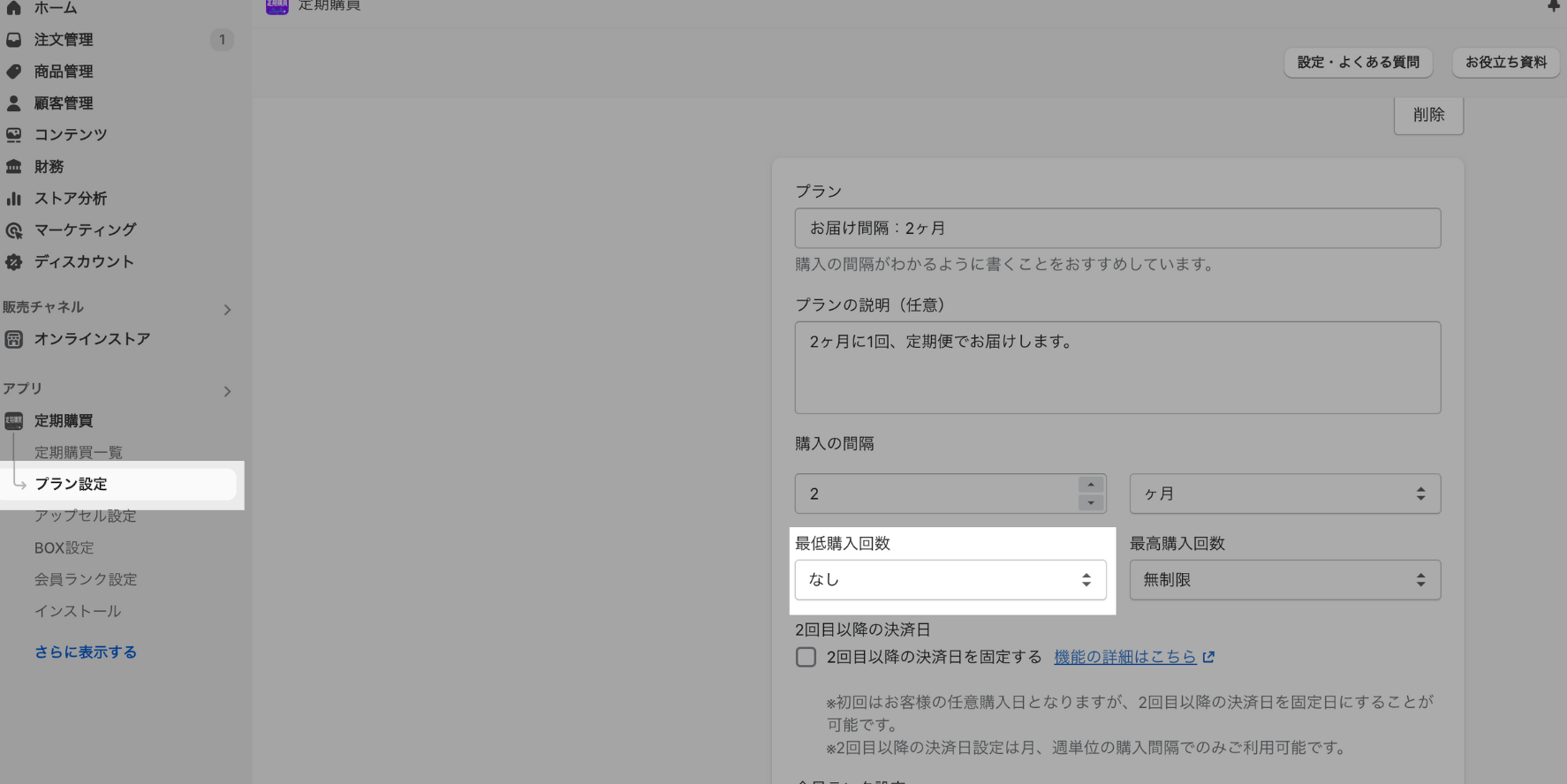 プラン設定の「最低購入回数」という項目に、購入回数の下限となる数字を記入して保存してください。