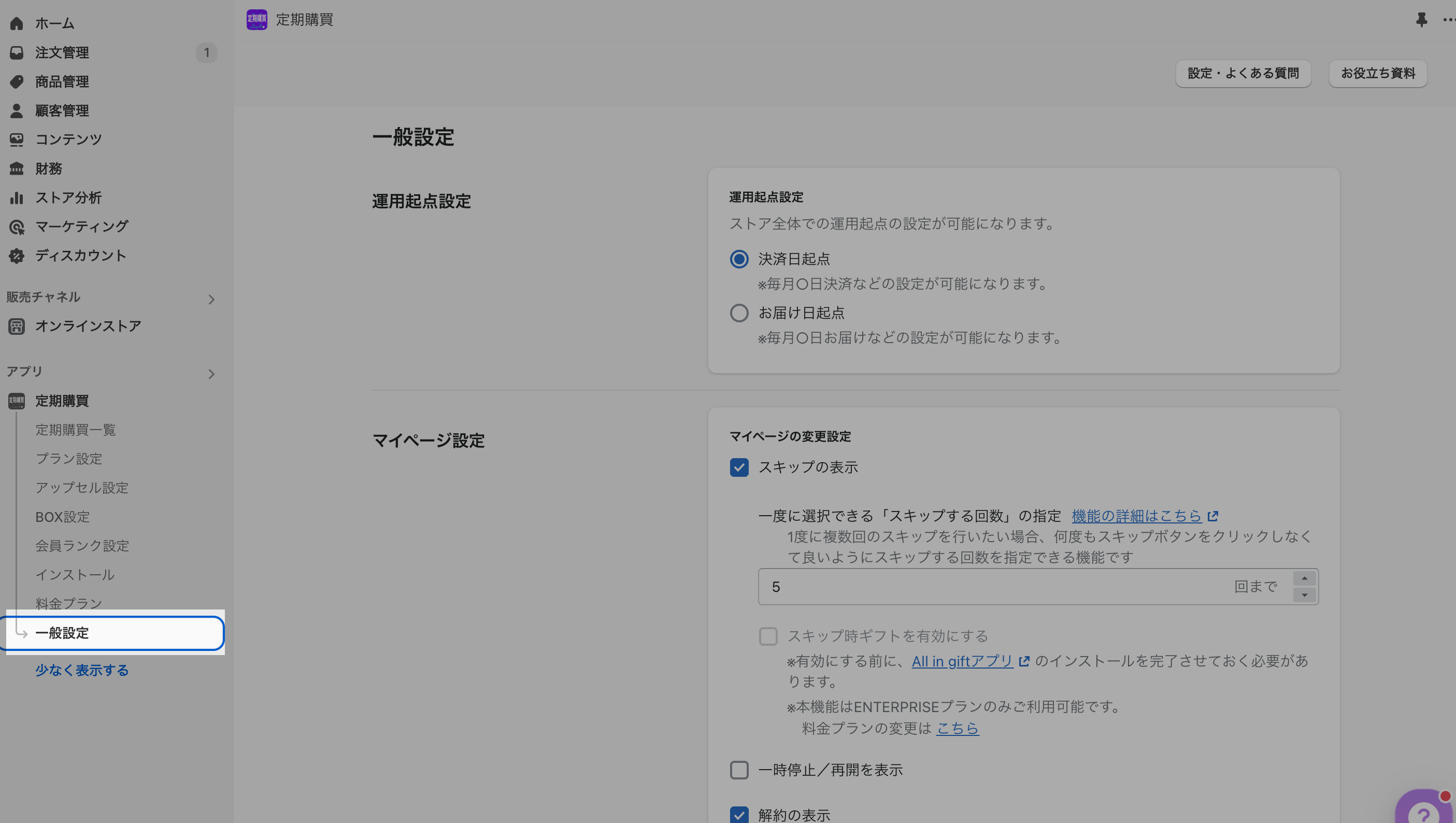 一般設定に遷移して、最低購入回数が適用されている間だけ、顧客マイページ上に表示しない機能(ボタン)を選択します。