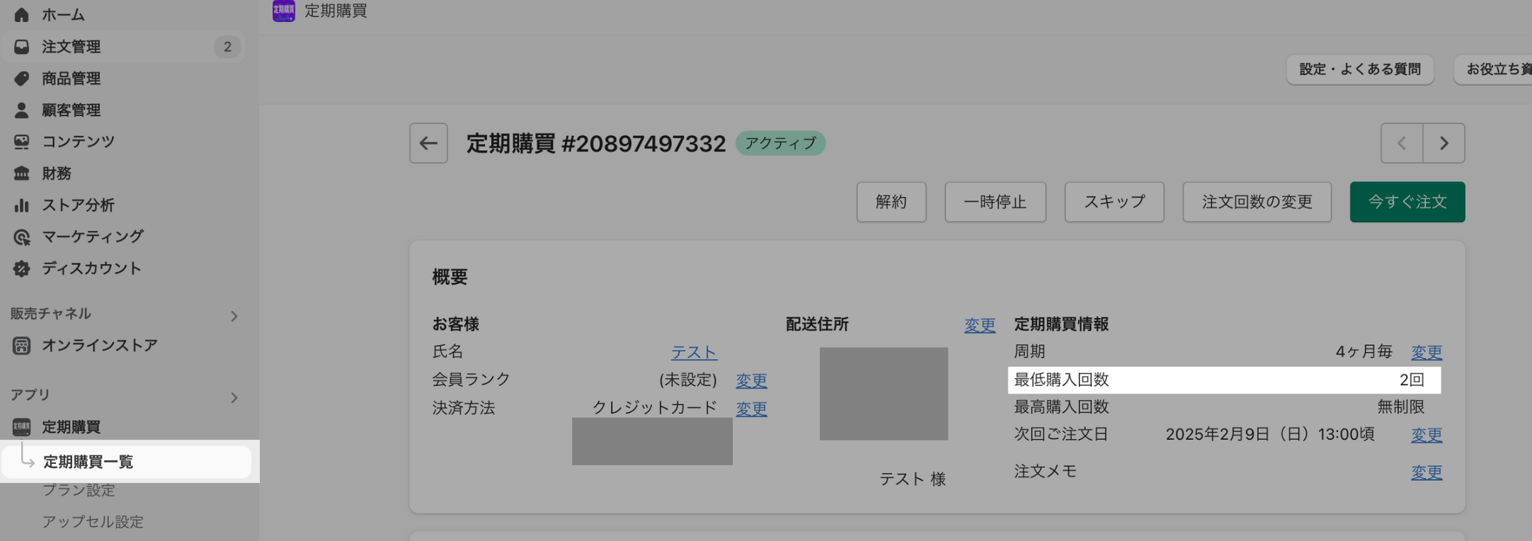 ※最低購入回数を満たしていない場合も、ストアの管理画面上では「解約」「一時停止」「商品の変更/削除/周期変更」が可能です。