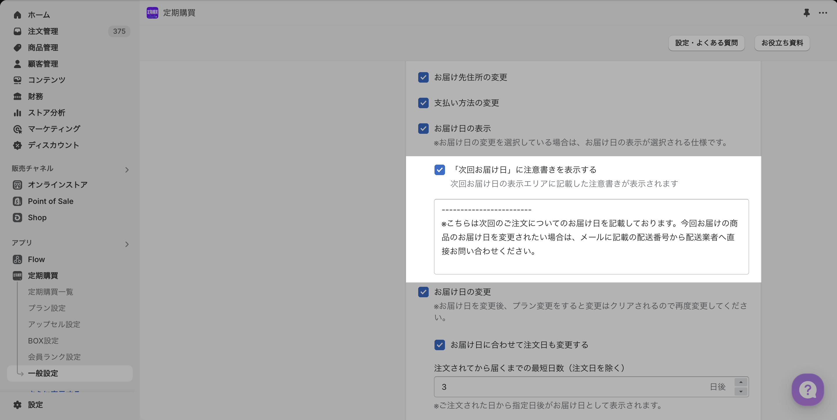左メニュー「一般設定」より、「次回お届け日」に注意書きを表示するにチェックを入れる。