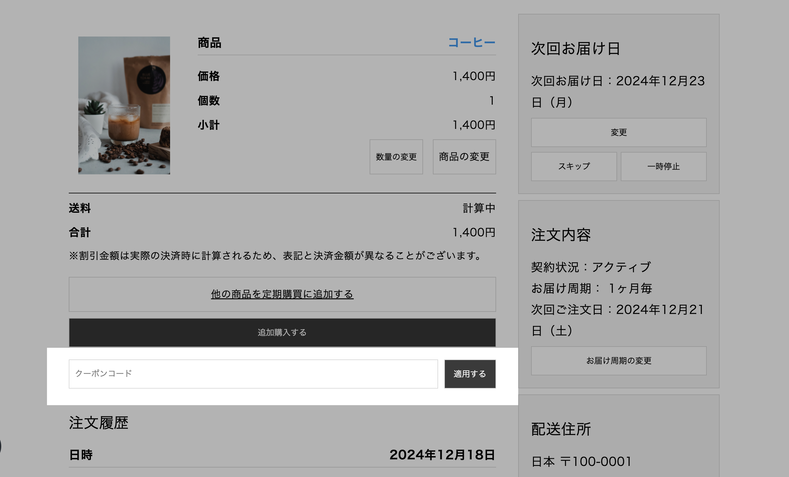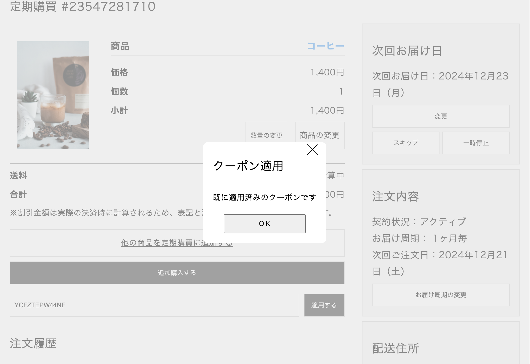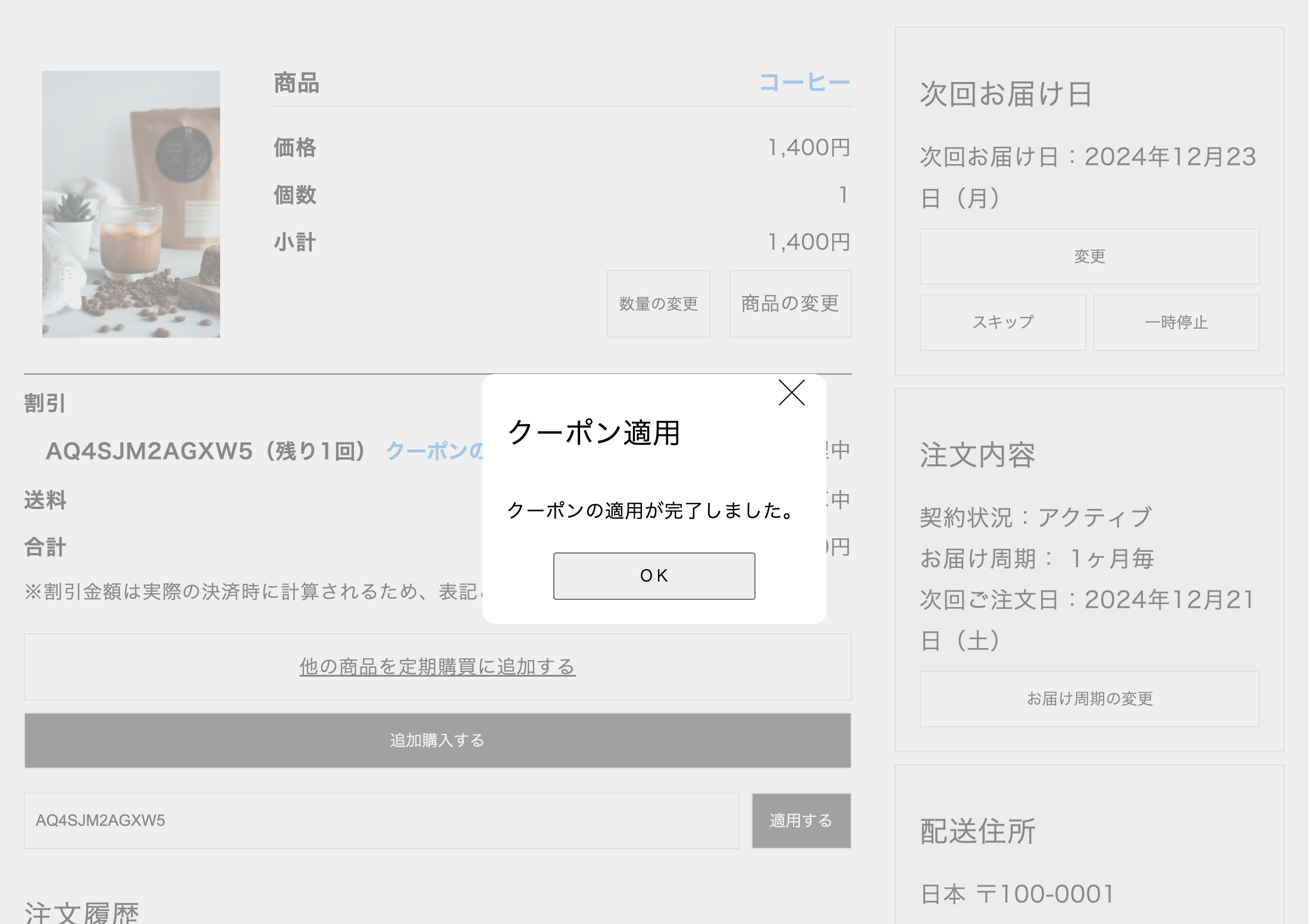 適用されたクーポンの内容が表示され、次回決済時にクーポンが適用された注文が作成されます。