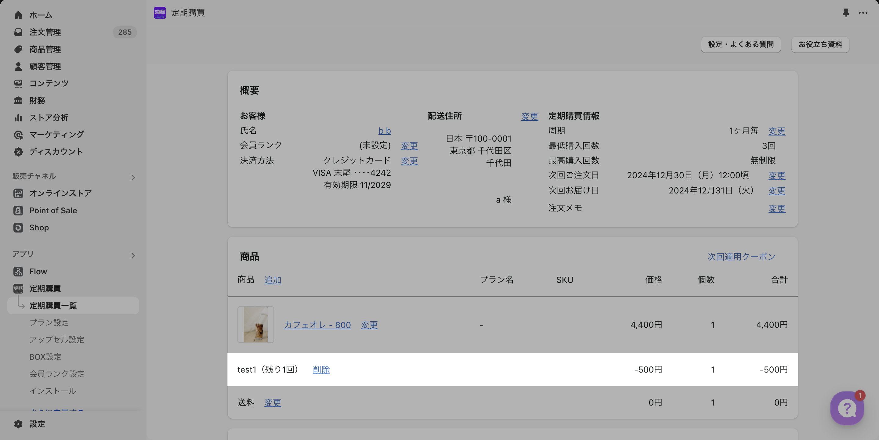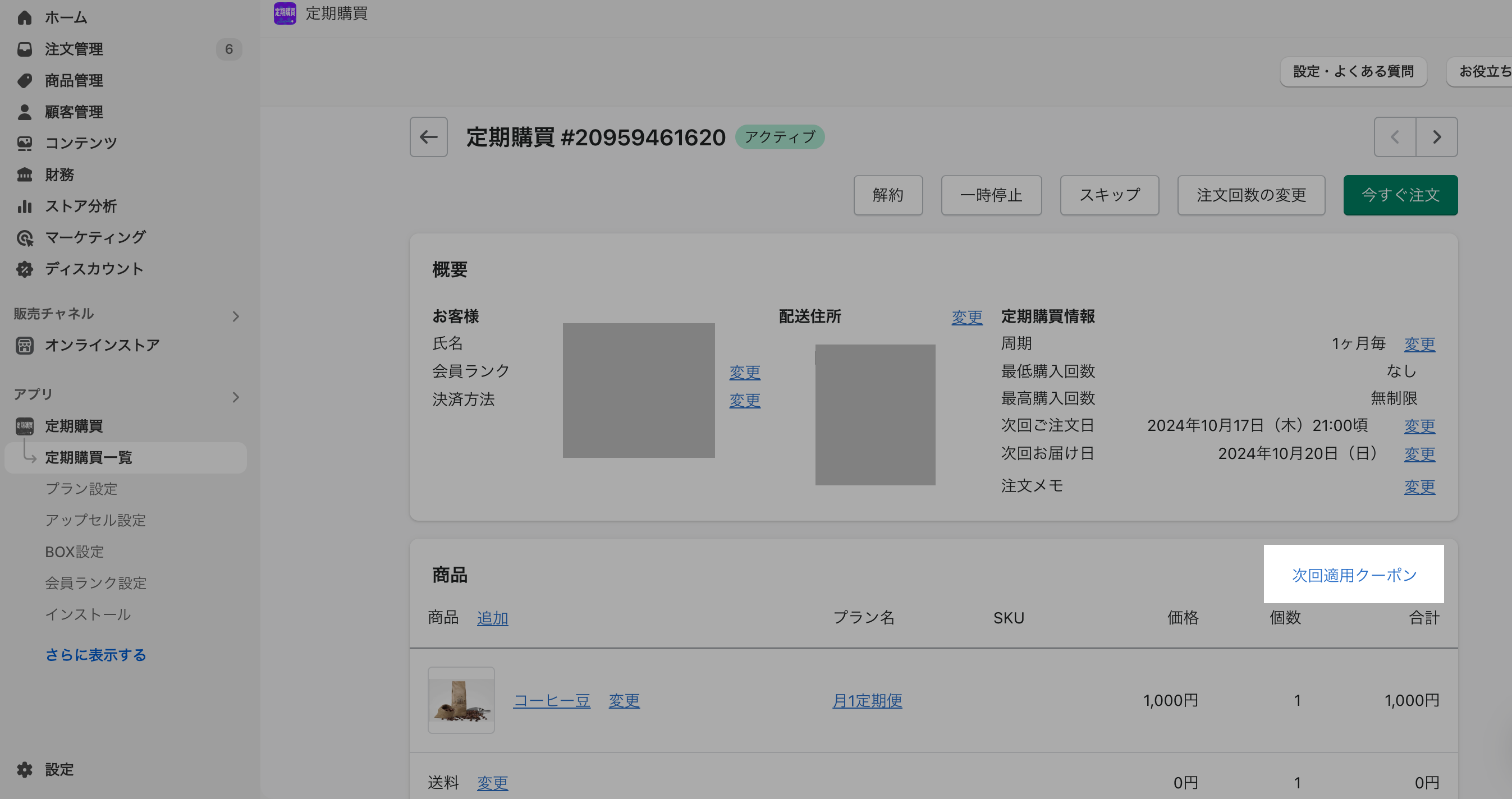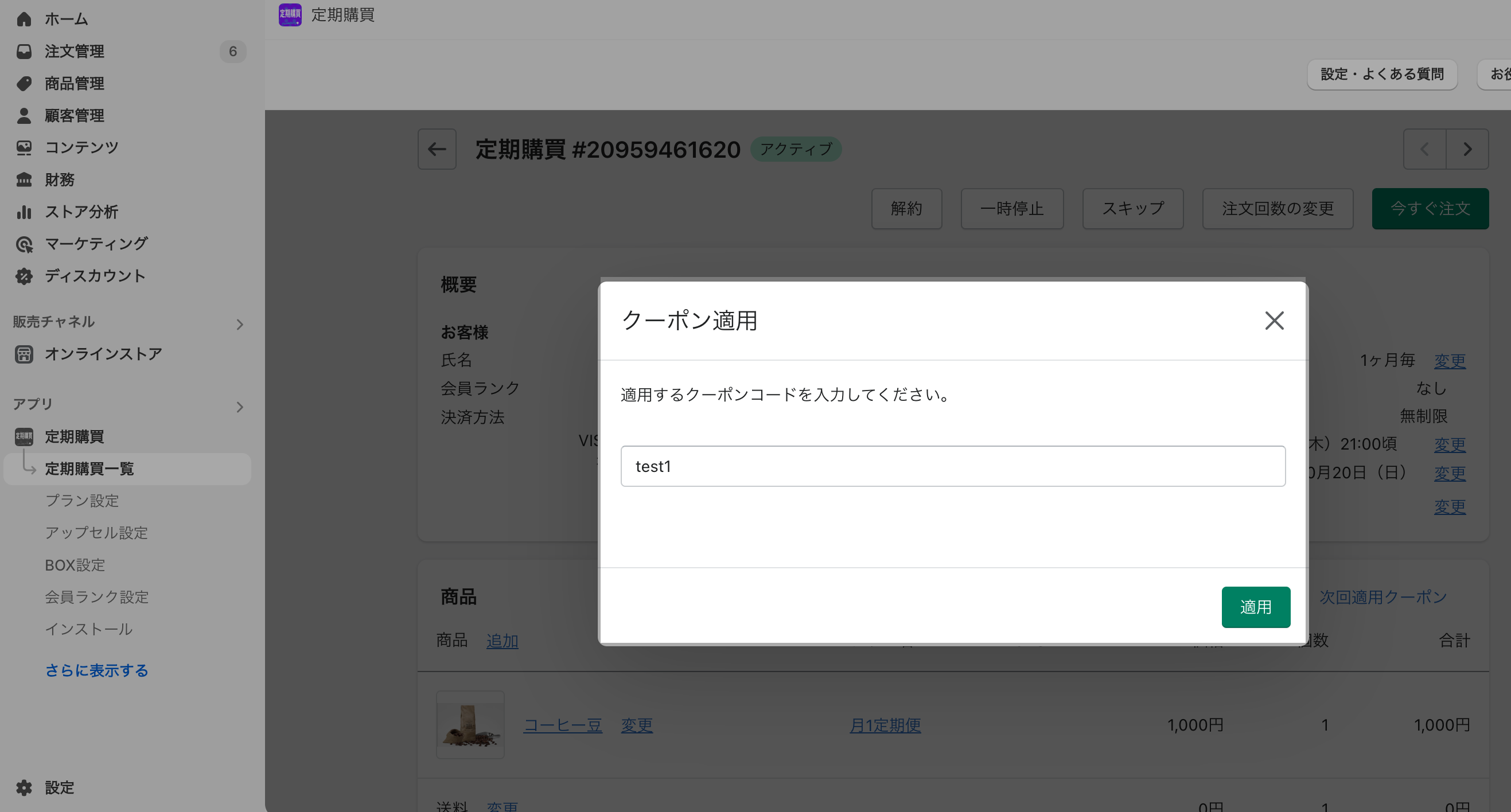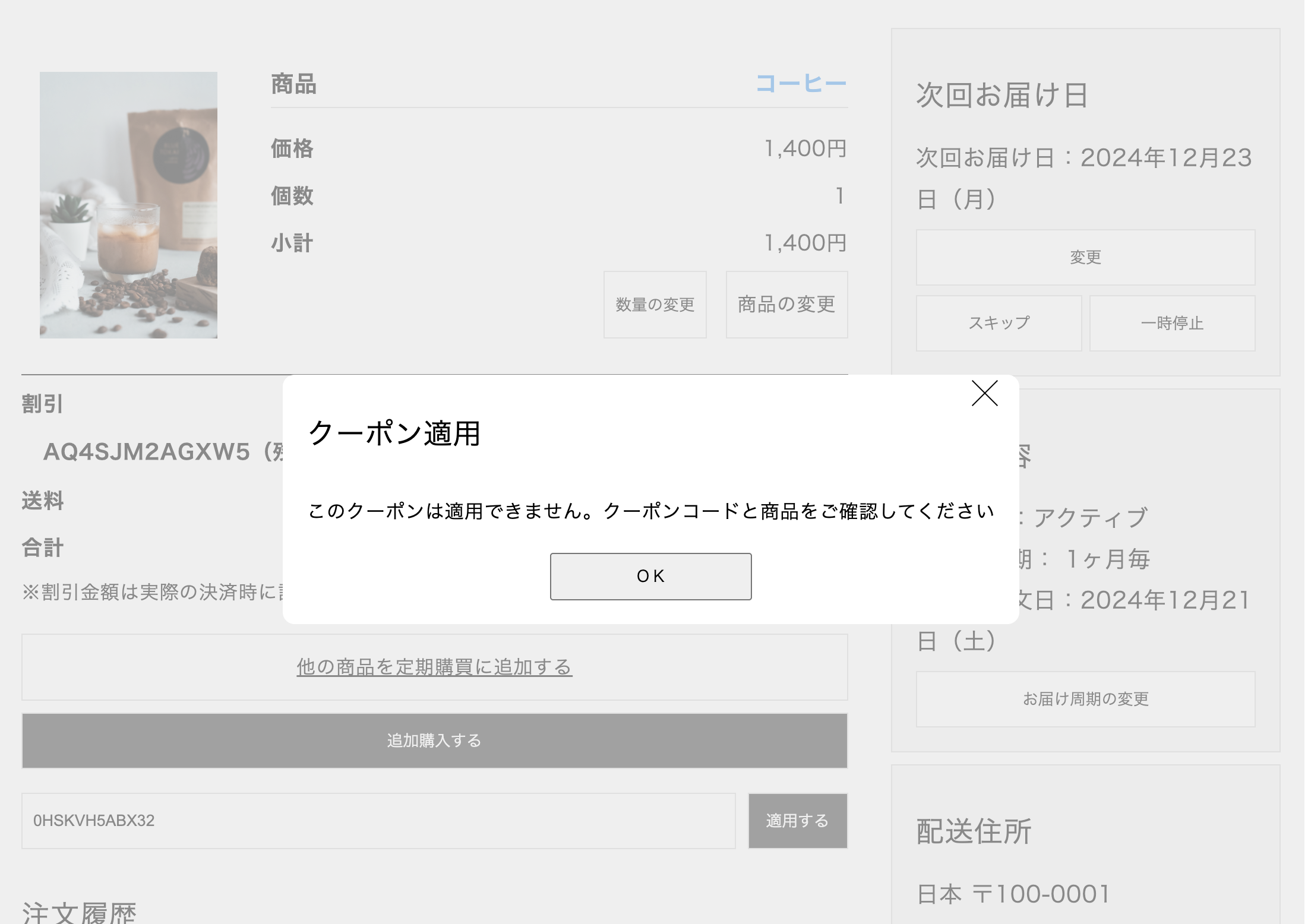 適用されたクーポンの内容が表示され、次回決済時にクーポンが適用された注文が作成されます。
