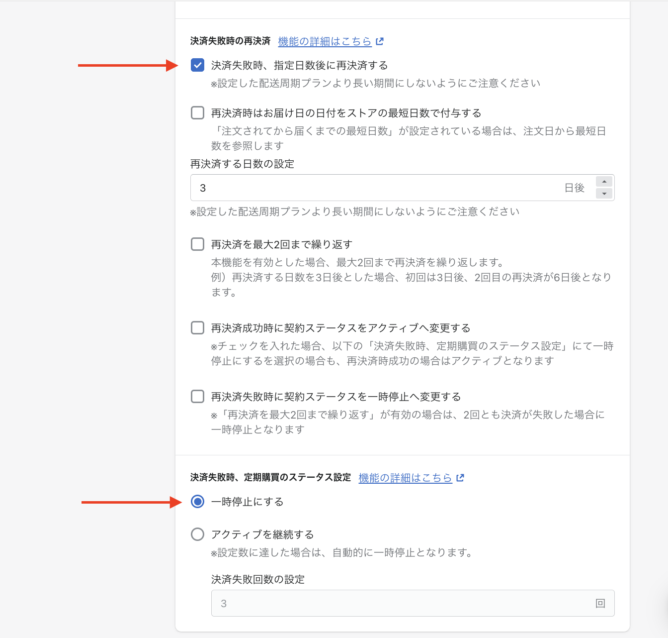 ・決済失敗後、指定日数後 (3日と設定されていると仮定する)に再決済するメール通知の送付タイミング・内容: