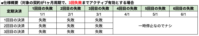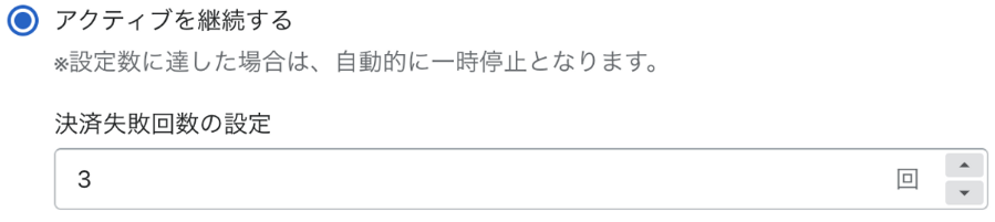 「アクティブを継続する」かつ「決済失敗回数の設定:3回」