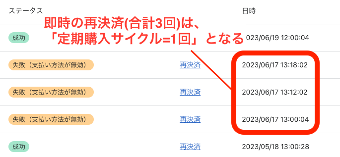 定期購買一覧では、 6分ごとのインターバルで走る即時の再決済もすべて表示されていますが、 「即時の再決済(合計3回)」は、「定期購入サイクル:1回」としてカウントされます。