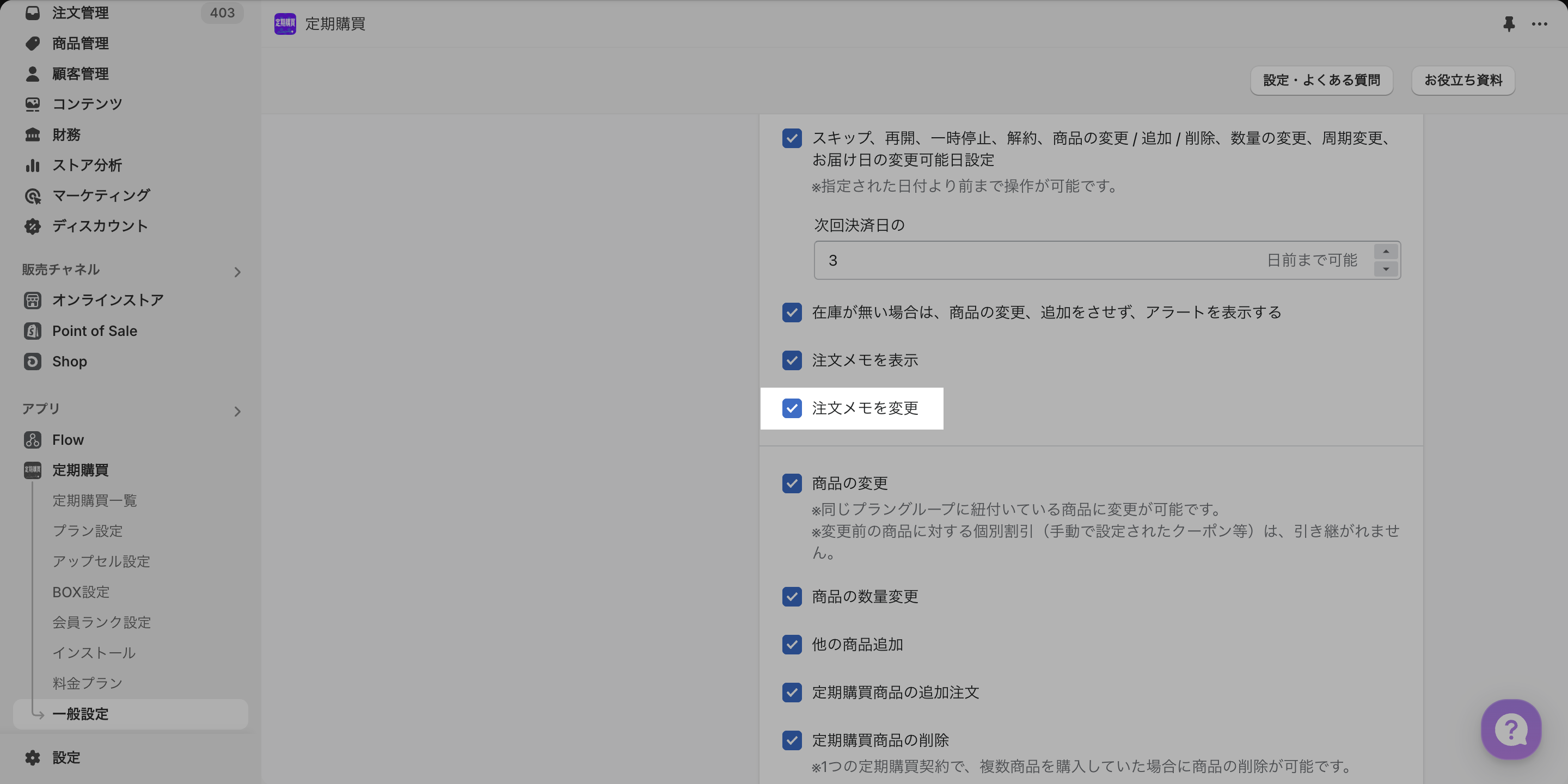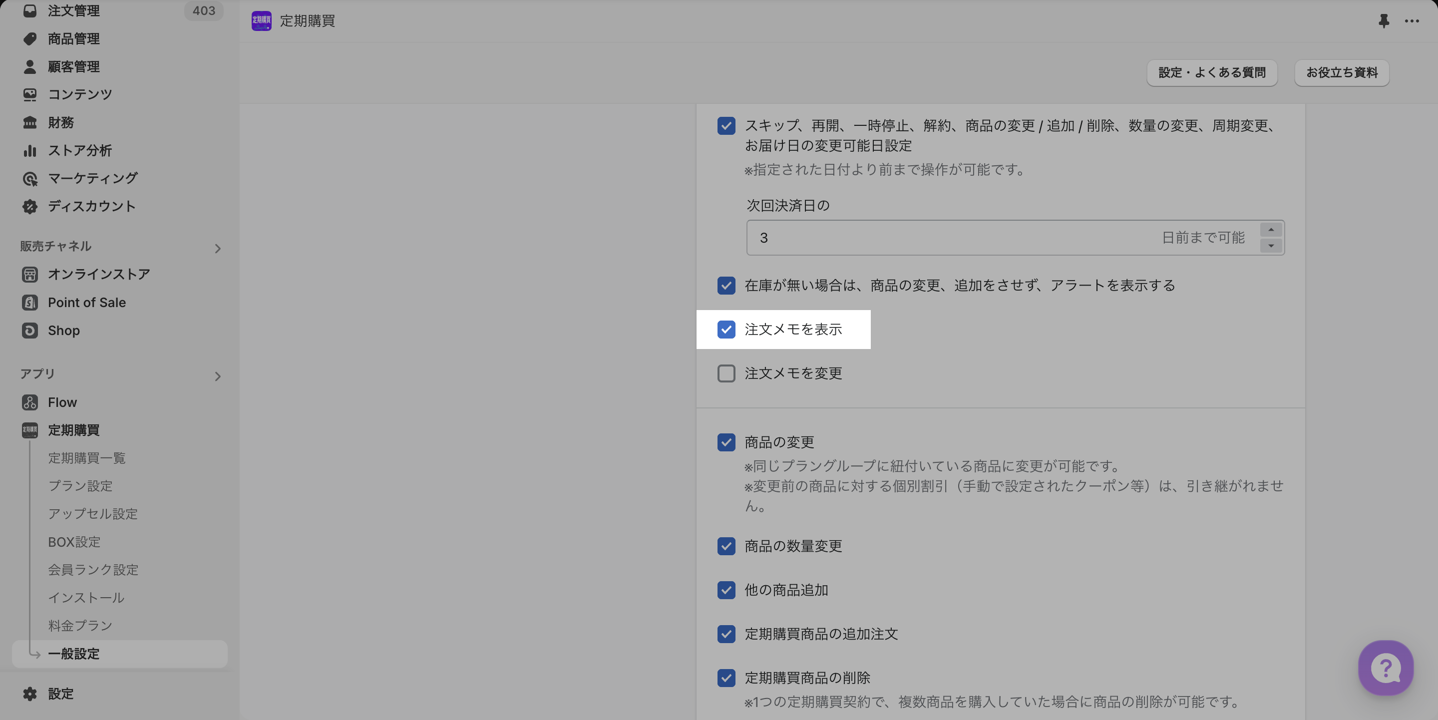 上記設定を行った上で、「注文メモを変更」にチェックを入れて保存します。