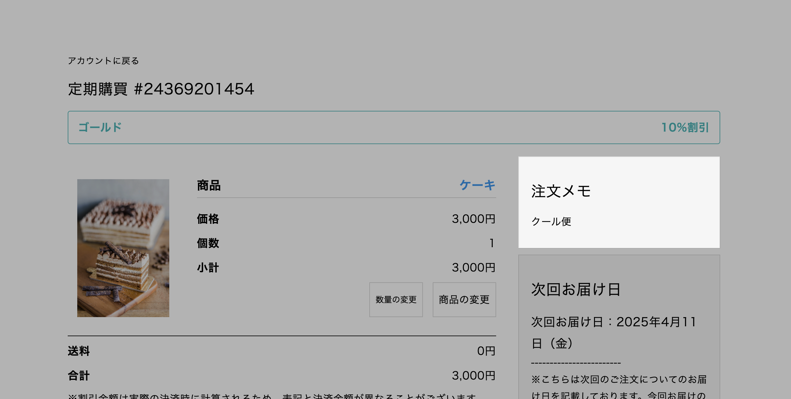 Shopify注文データの「メモ」に表示される詳細情報を、マイページ上で表示・変更することができる機能です。