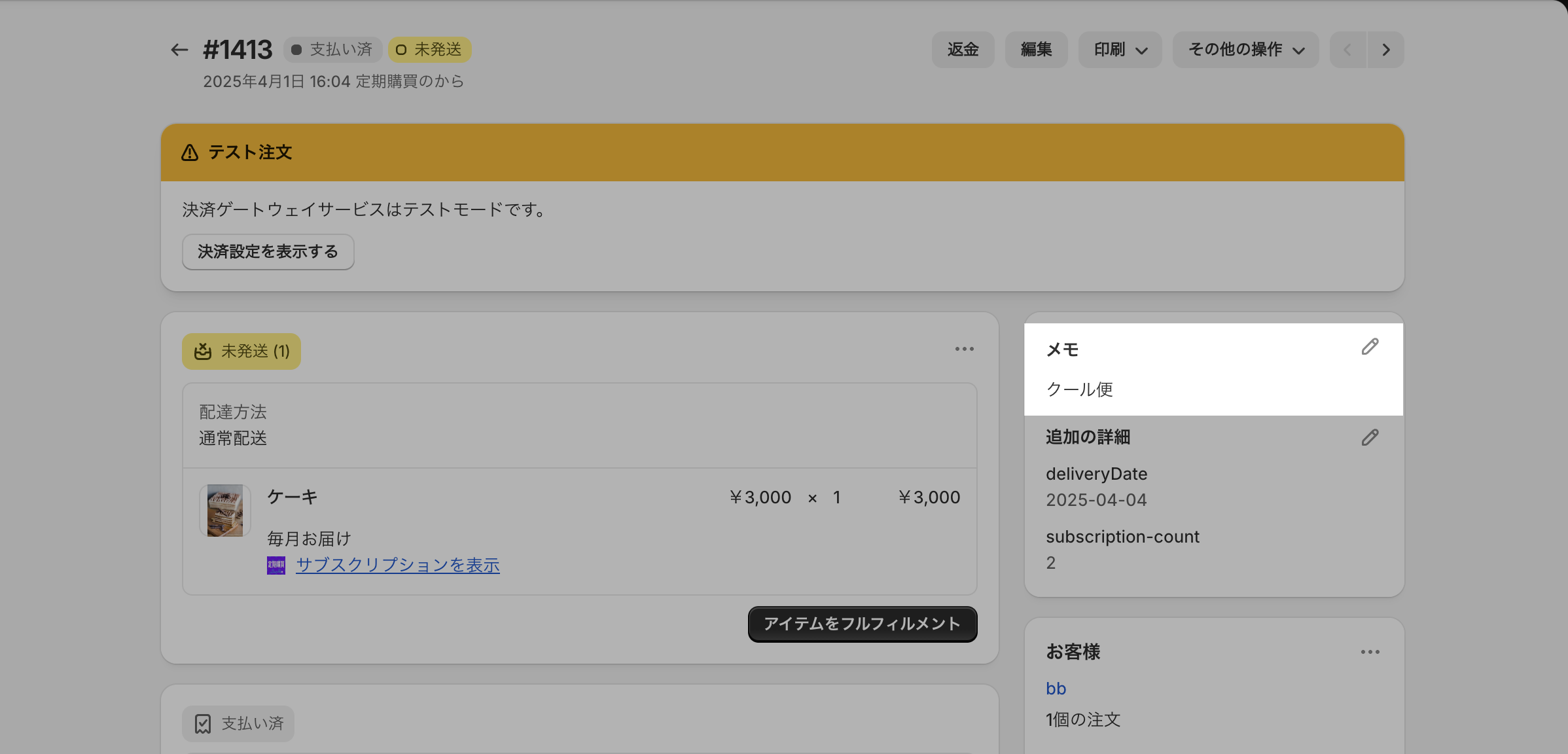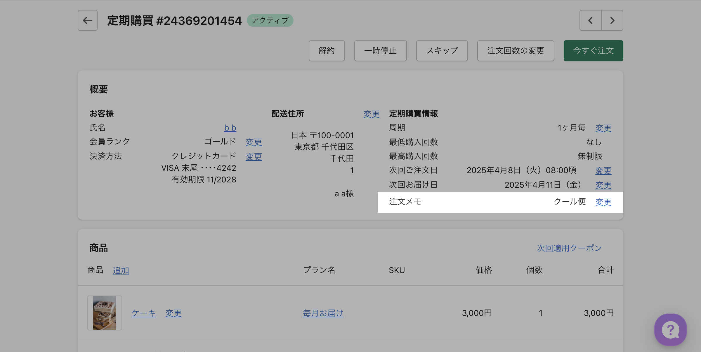定期購買アプリで注文メモを空欄にした場合、次回注文時のShopify側の注文メモも空欄になります。