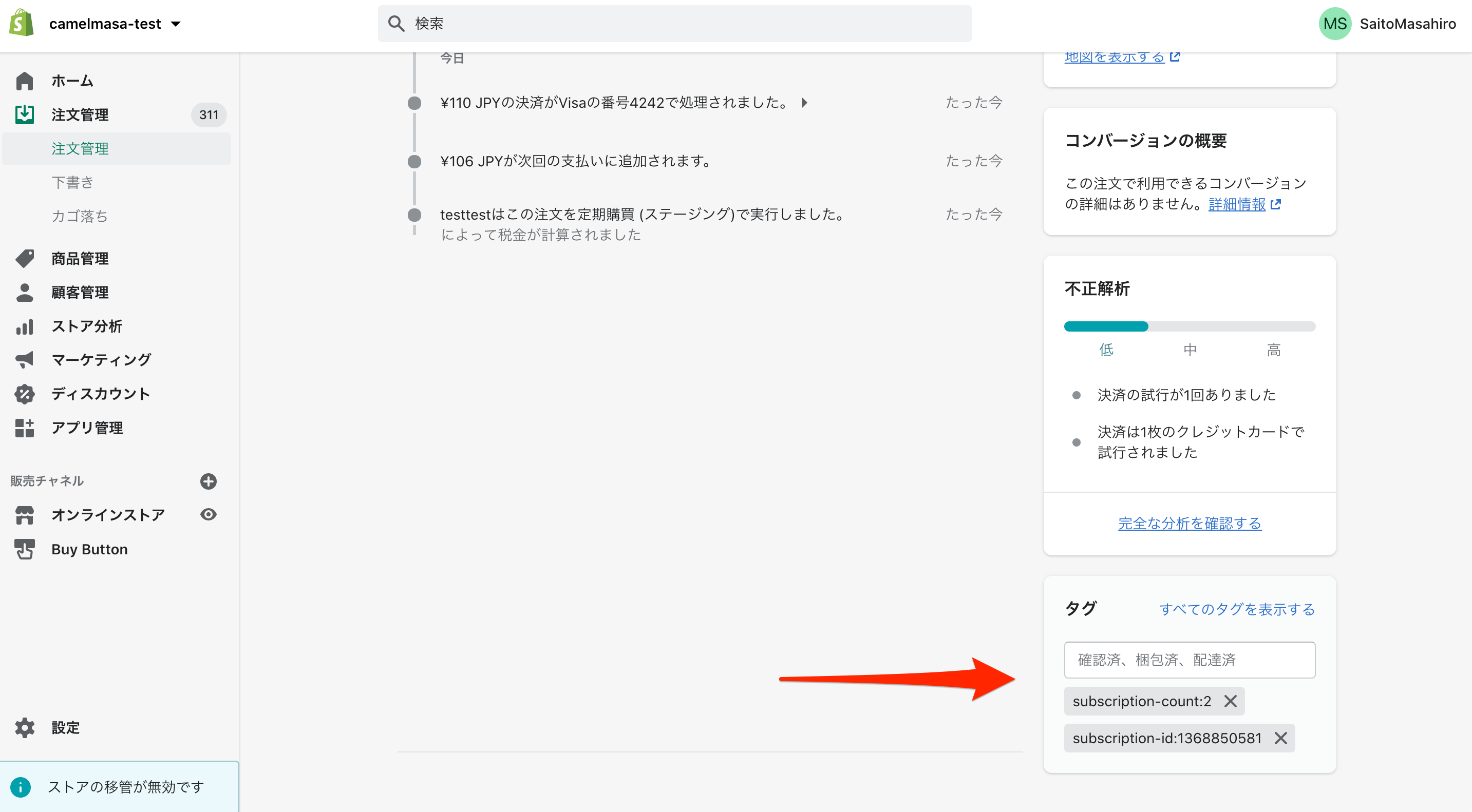 注文作成時に自動的に注文回数、注文番号(注文ID)、配送日のタグを付与することができます。付与するタグのON/OFFの切り替えも可能です。