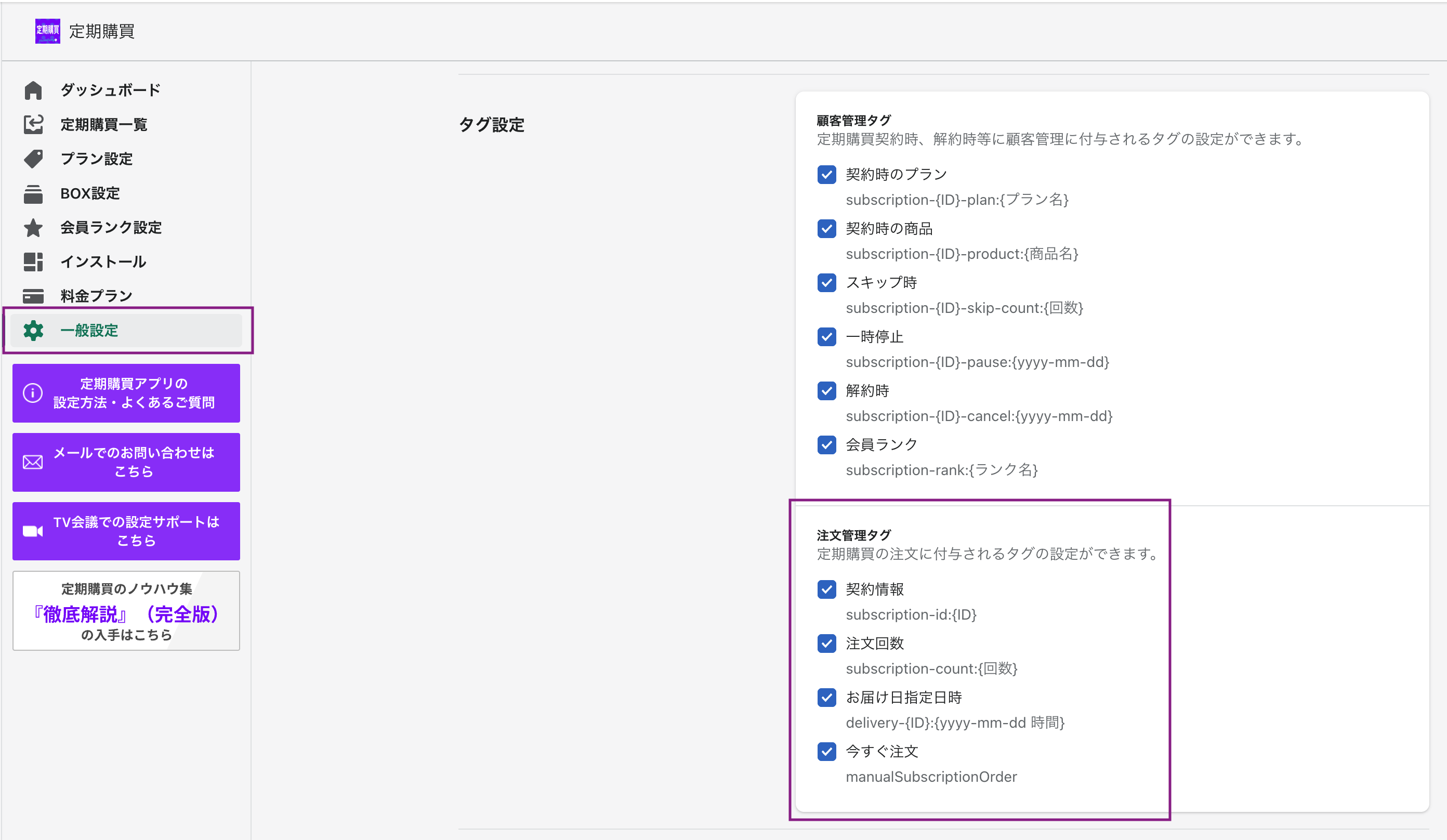 「一般設定」>「タグ設定」より、付与するタグの「ON/OFF」を切り替えることができます。