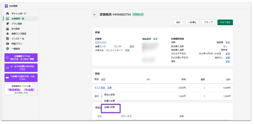 2.商品名の横にある「変更」のリンクをクリックし「金額の変更」を選択します。