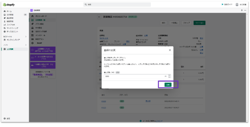 定期購買アプリ管理画面「定期購買一覧」> 定期購買詳細画面にて、個別に金額変更が可能です。