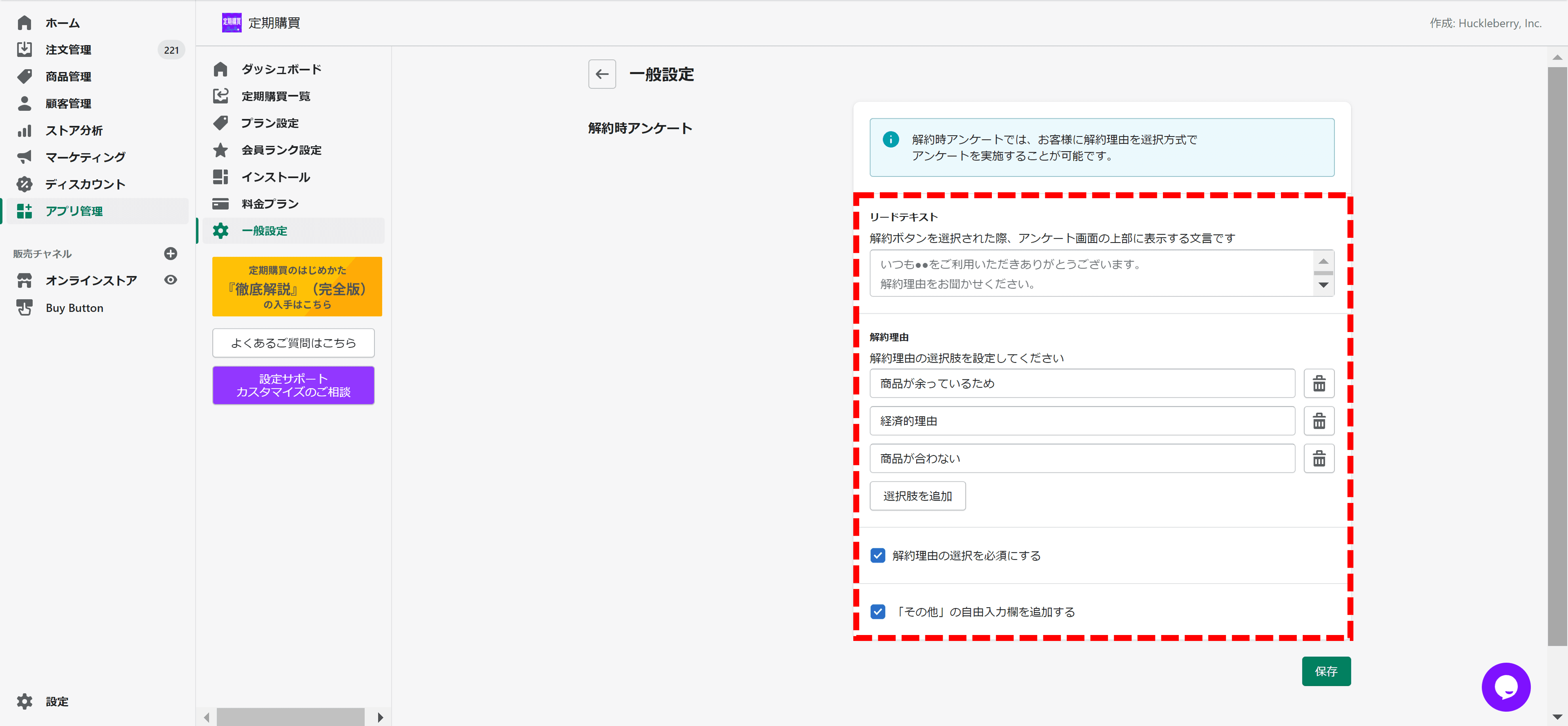 「リードテキスト」の追記や「解約理由の選択肢」を追加を行い、「解約理由の選択を必須にする」「その他の自由入力欄を追加する」が必要な場合はチェックを入れて保存して下さい。