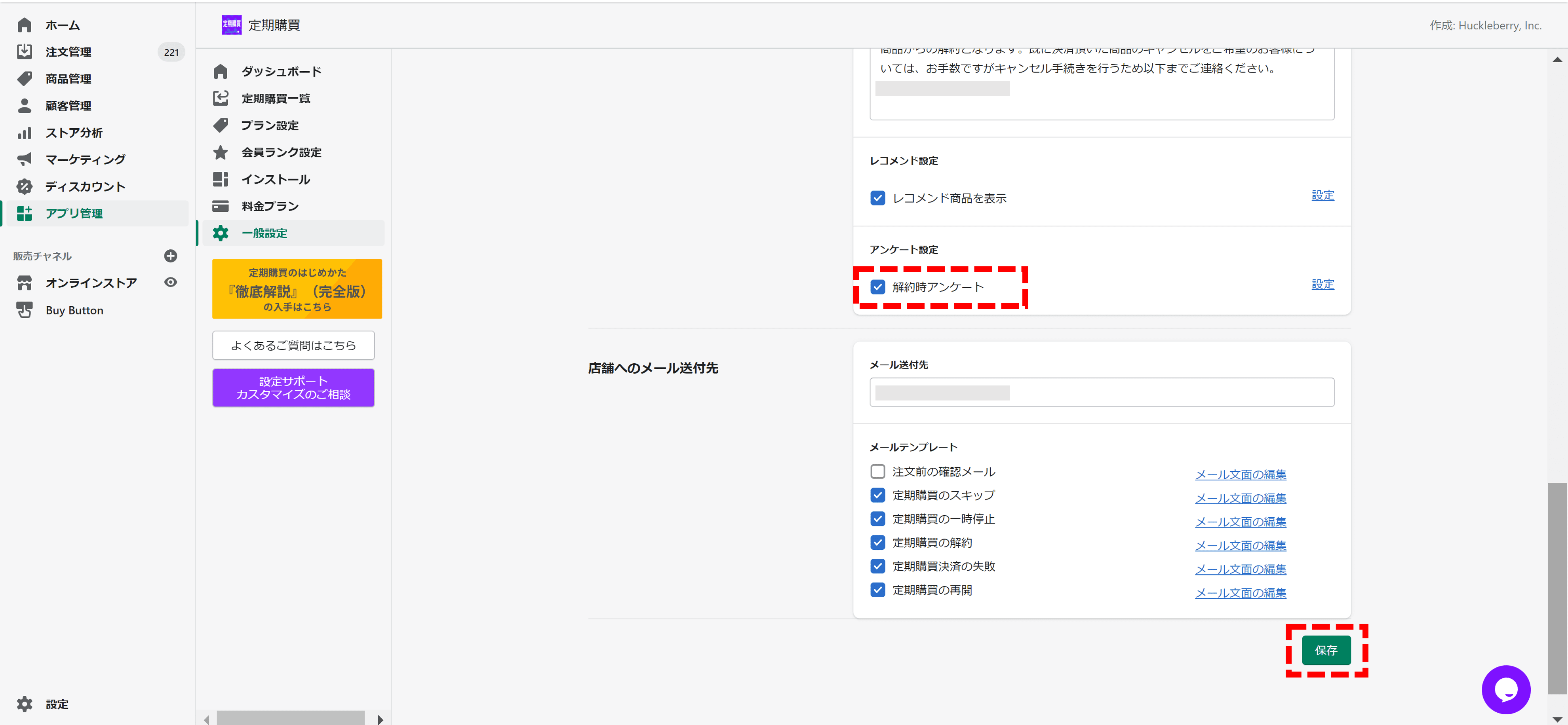 「一般設定」画面に戻り「解約アンケート」にチェックを入れ、保存して下さい。