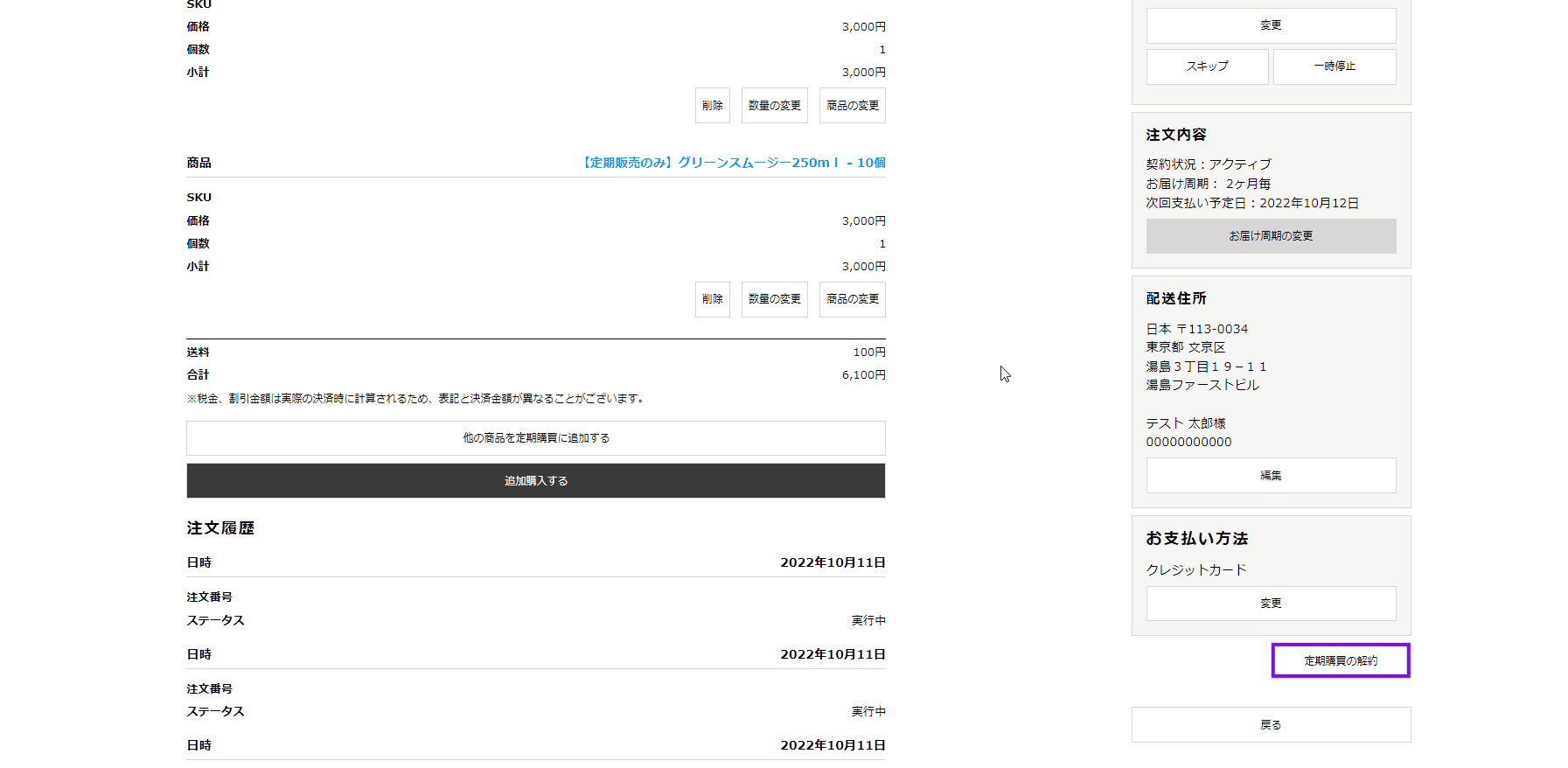 マイページ上の「定期購買一覧」を選択し、該当の注文詳細を開きます。その後、ページの下部にある「定期購買の解約」を押下後、アンケートが表示されます。