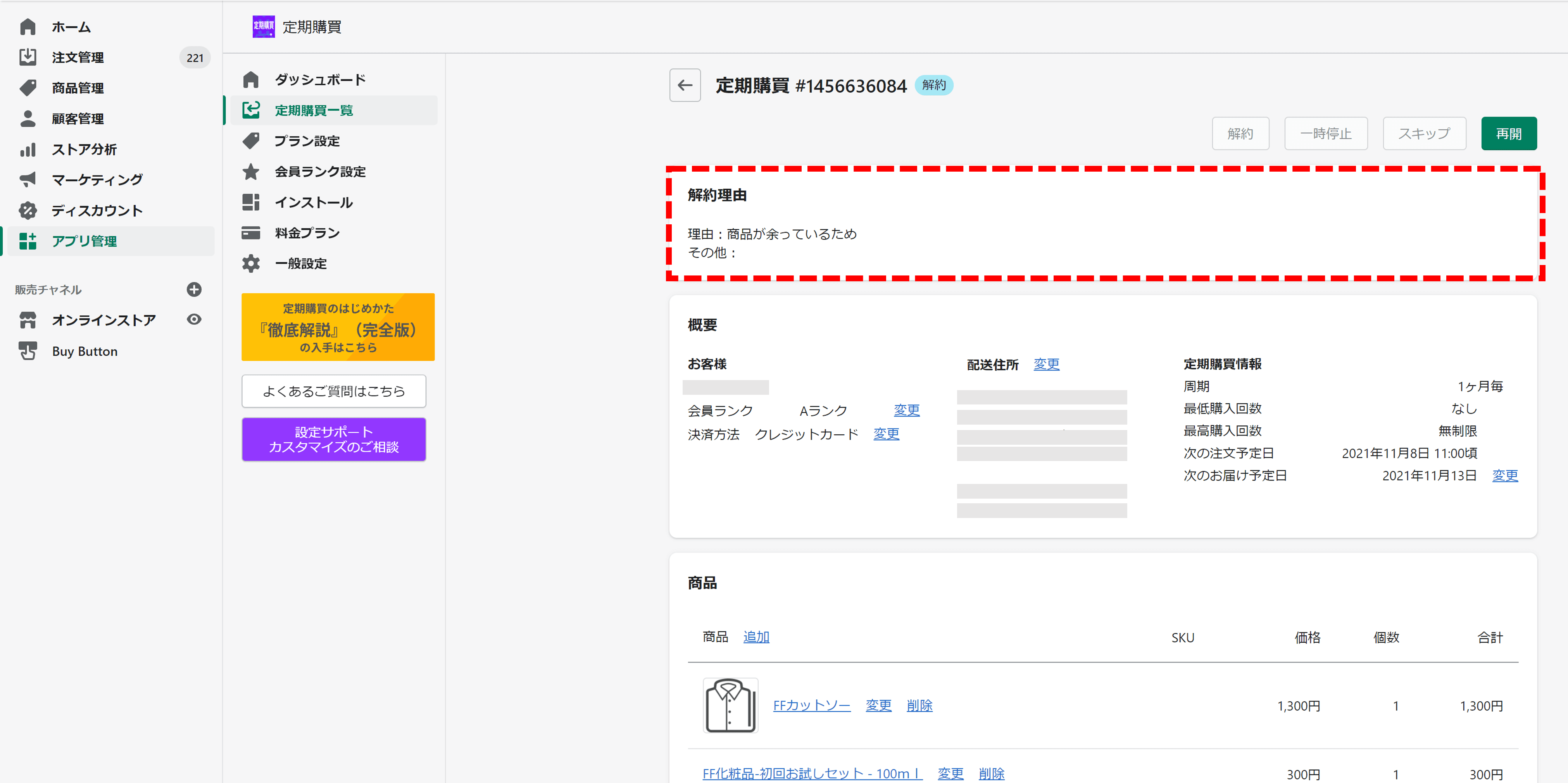 ストア管理画面からの解約時、本機能は利用できません。(アンケートは表示されません。)