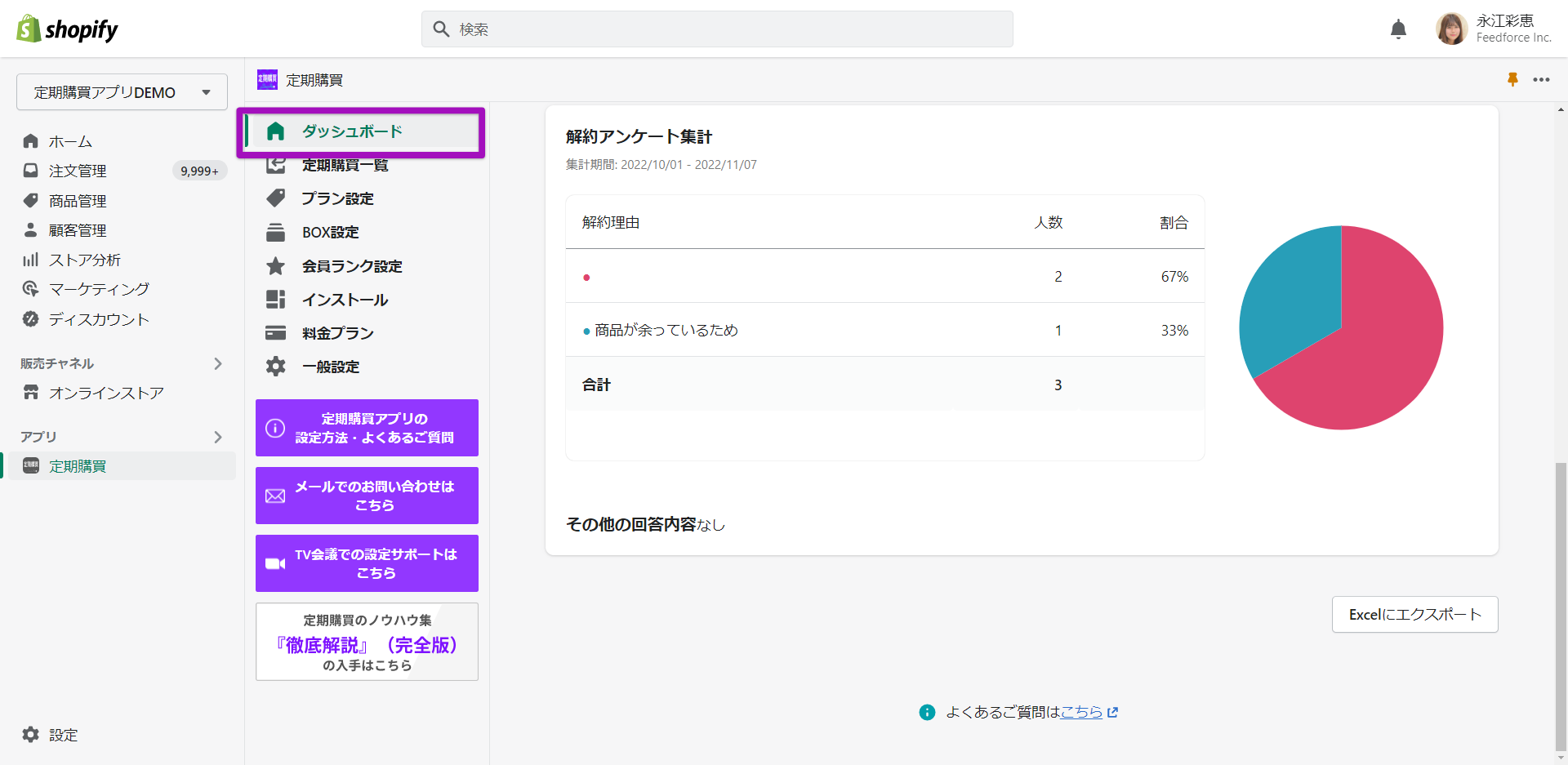 定期購買一覧からエクスポートした「契約ごと」のデータの「解約理由」「解約理由詳細」というカラムにアンケート結果が表示されます。