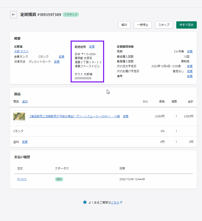 配送住所の変更後に作成された定期注文では、「配送先住所」という項目に変更後の新しい住所が記載されるようになります。