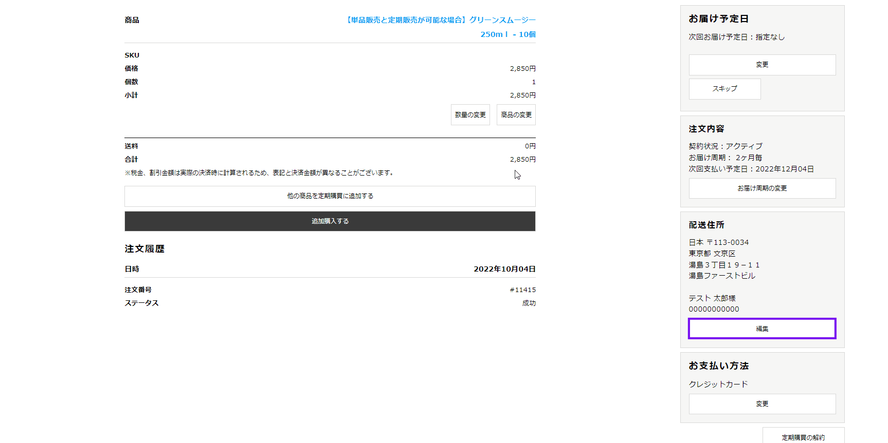 マイページ上の「定期購買一覧」を選択し、変更したい注文詳細を開きます。その後、「配送住所」欄にある「編集」を押下することで住所の変更ができます。