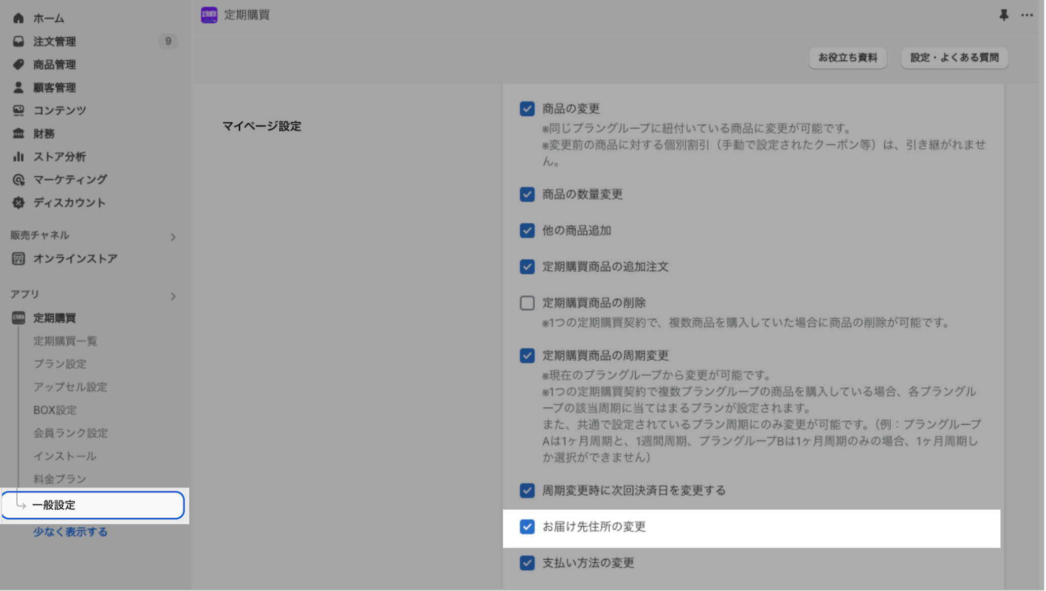 定期購買アプリの一般設定にて「お届け先住所の」変更にチェックを入れ、保存してください。