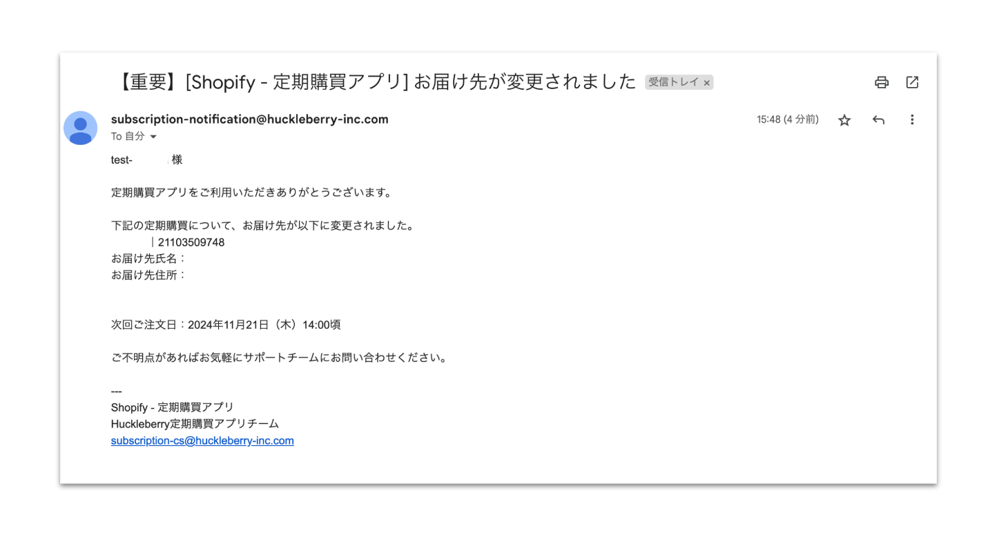 顧客マイページで配送住所が変更された場合のみストア側へ下記の通知が送付されます。