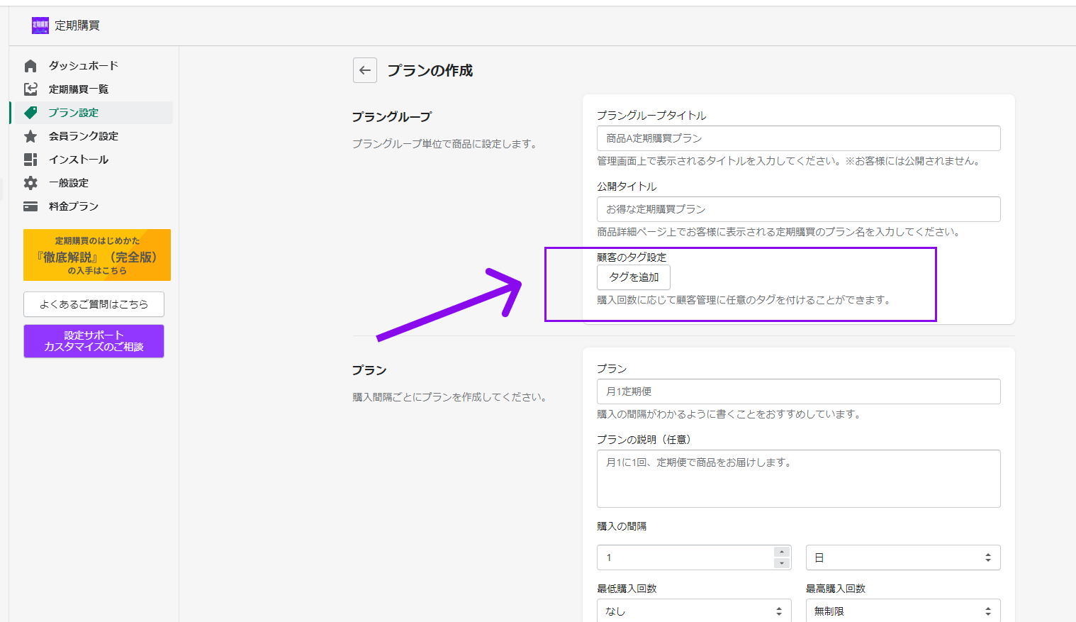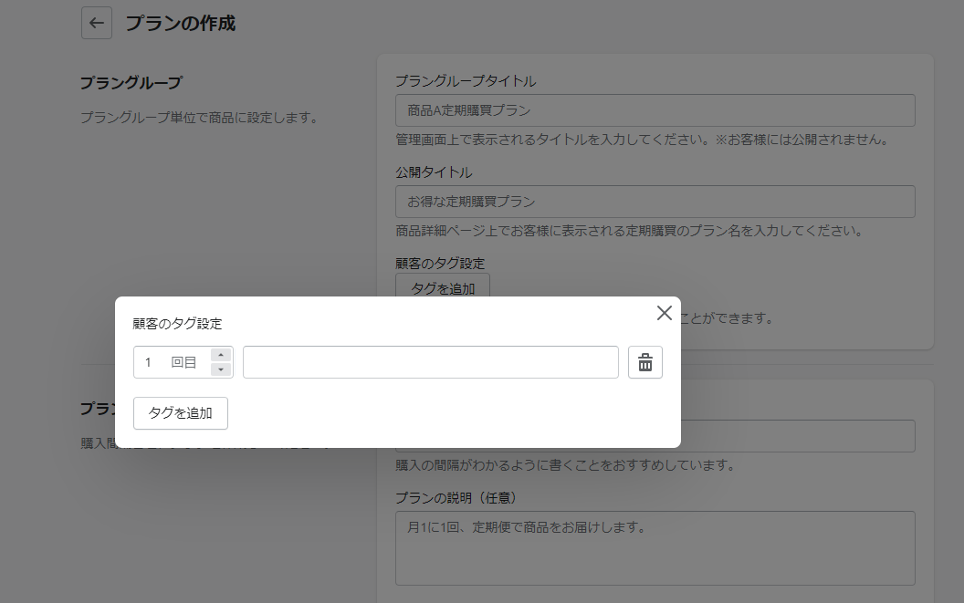 購入回数に応じて顧客管理に任意のタグを付けることができる機能です。 そのプランで購入された既存契約が存在する場合、既存契約に対しても設定内容が反映されます。