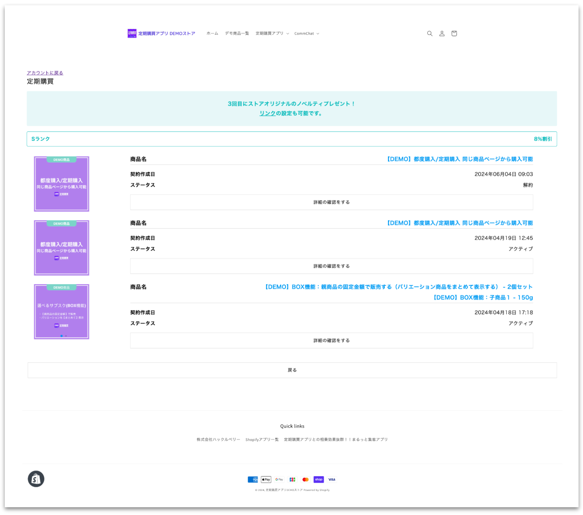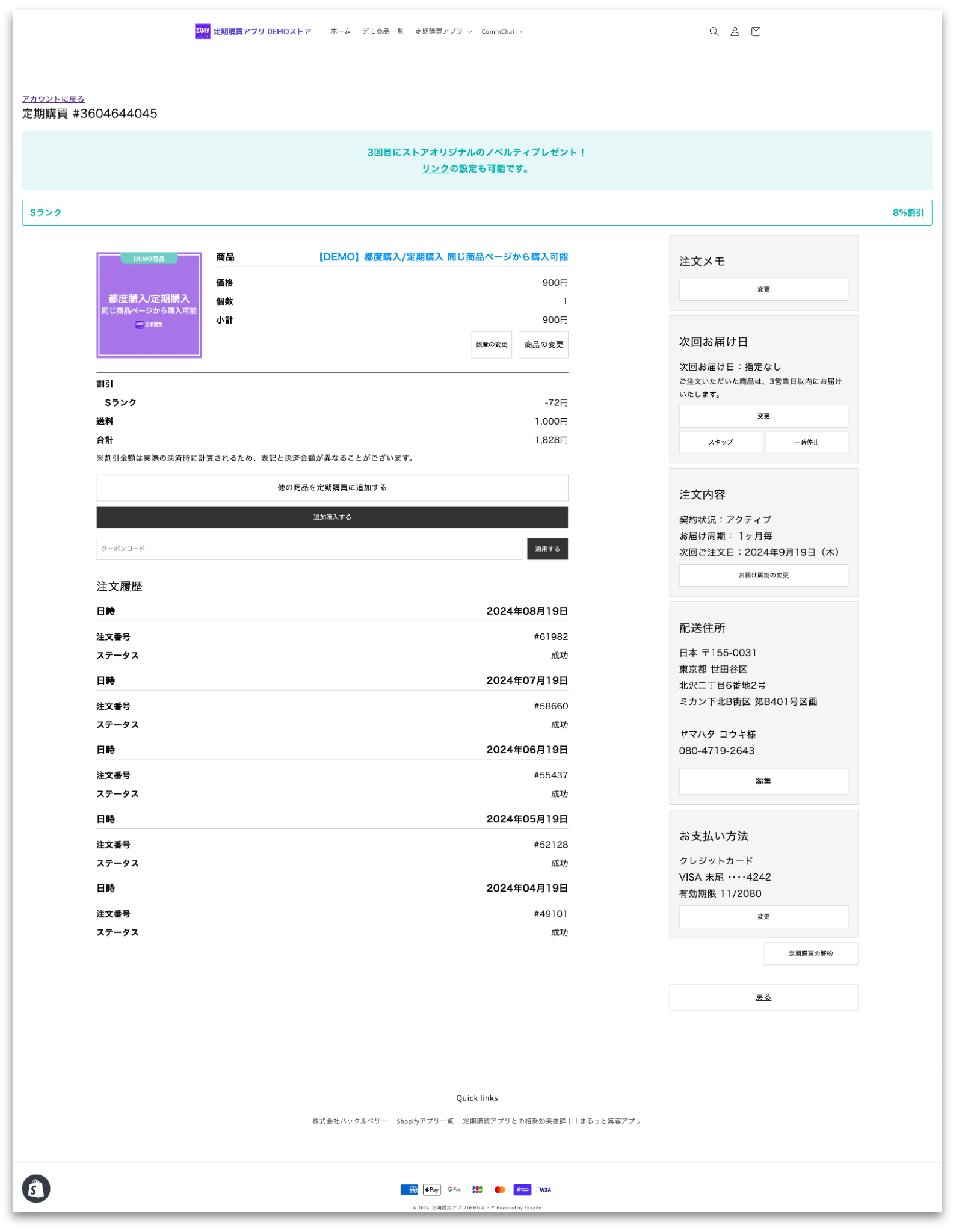 顧客(エンドユーザー)が、いつでも定期商品の確認やスキップなどができるページです。