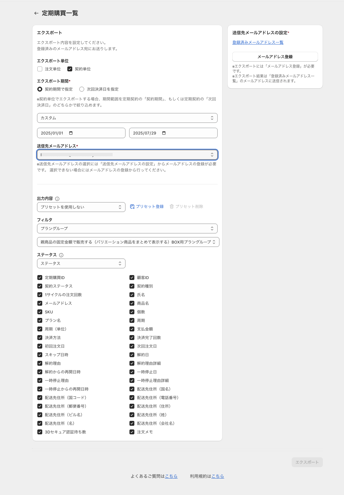 ・エクスポート期間:契約期間で指定