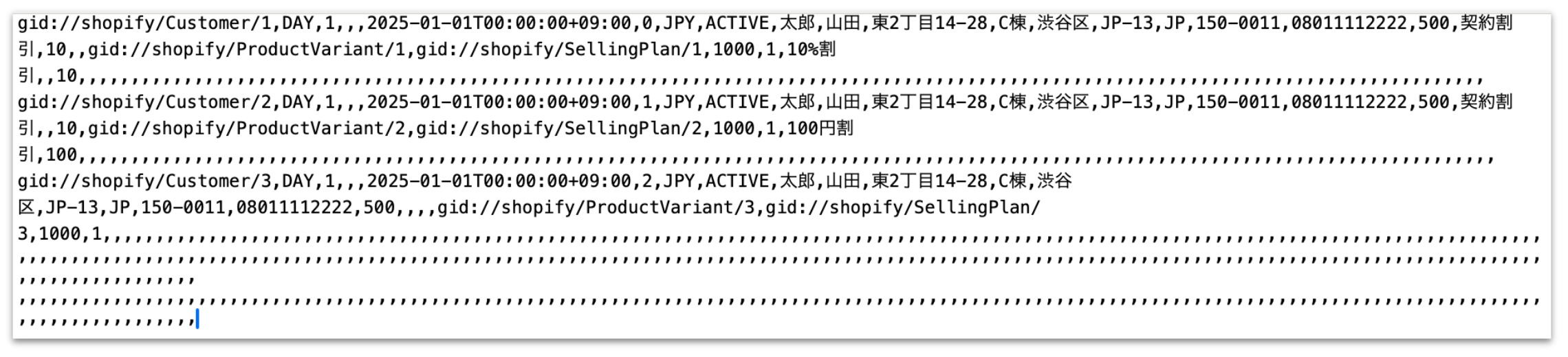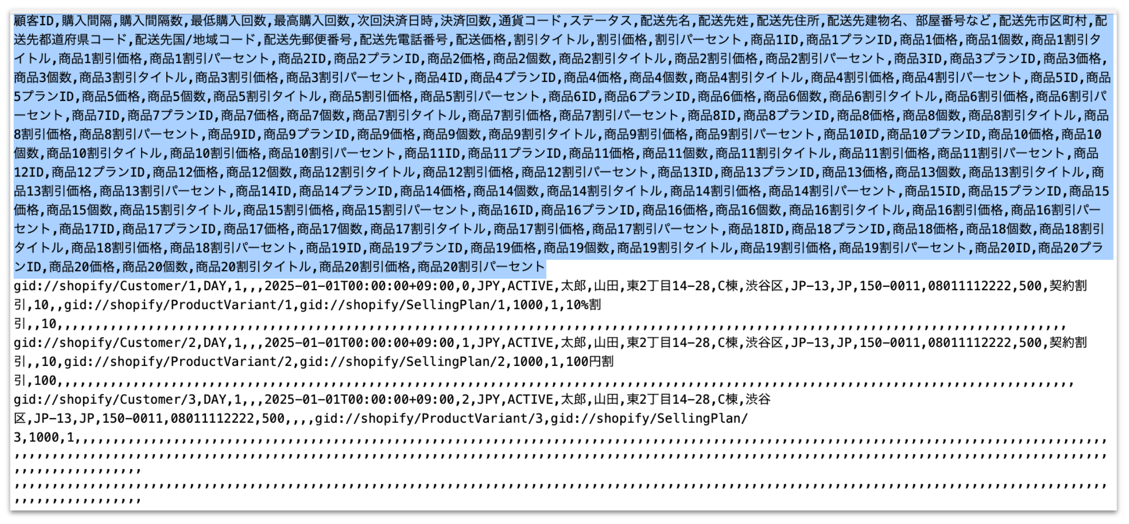 3-2. 顧客ID、商品バリアントID、プランIDデータの取得でエクスポートしたもの)