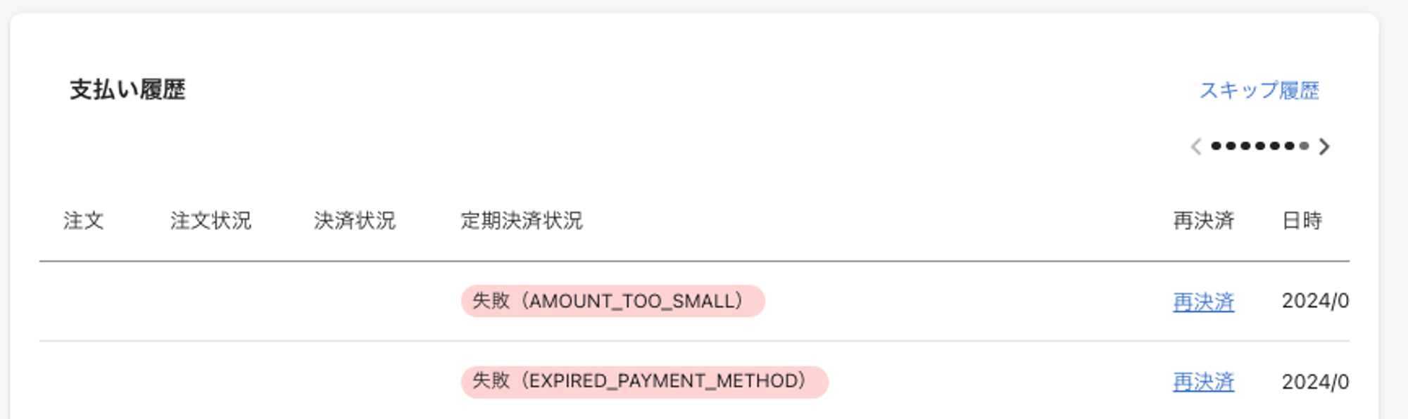 合計3回決済が失敗された時点で、今回の注文はスキップとなり、定期契約ステータスが