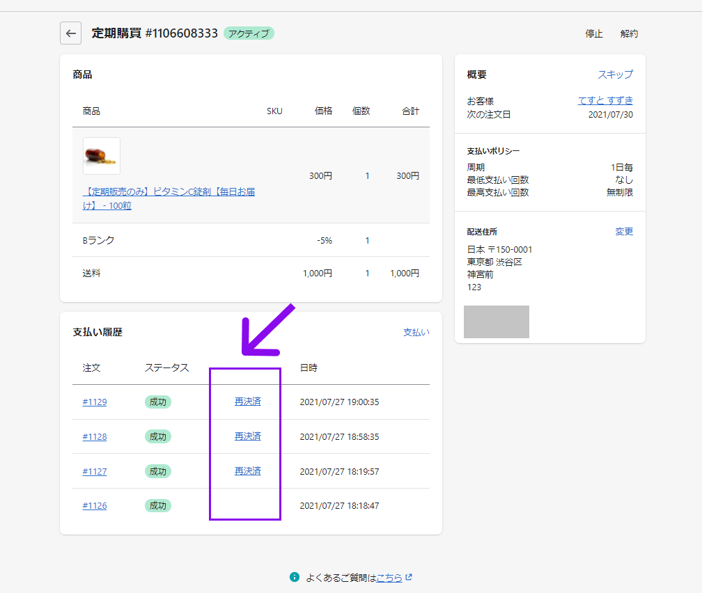 再開された契約は、次回ご注文日のタイミング(初回定期購買を起点とし、設定した定期購買のルーティングに沿って)で決済が実行され、成功した場合は、通常の定期購買のルーティングに戻ります。