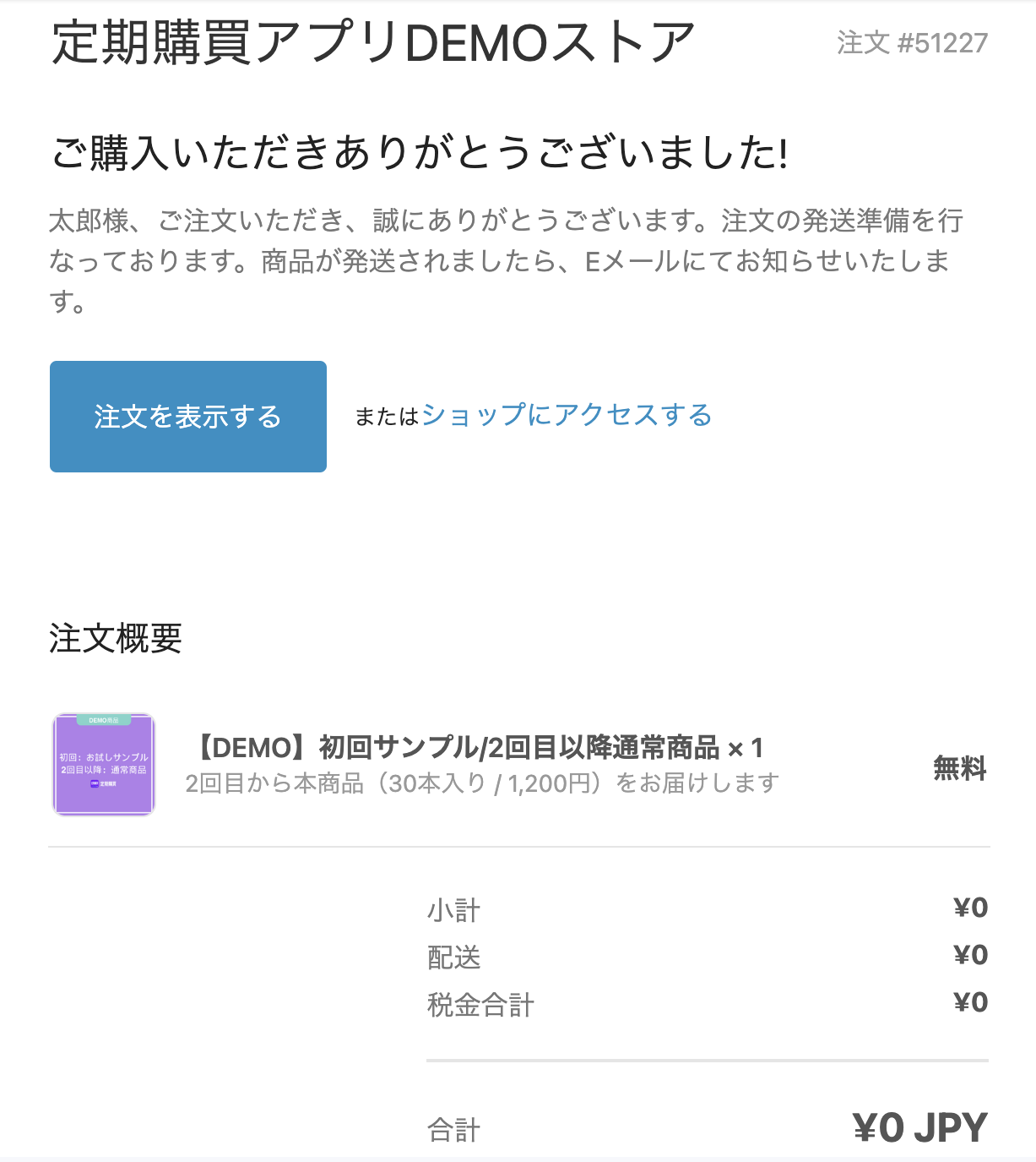 2回目以降の注文では、通知の「注文概要」に2回目以降購入用の商品が表示されるようになります。