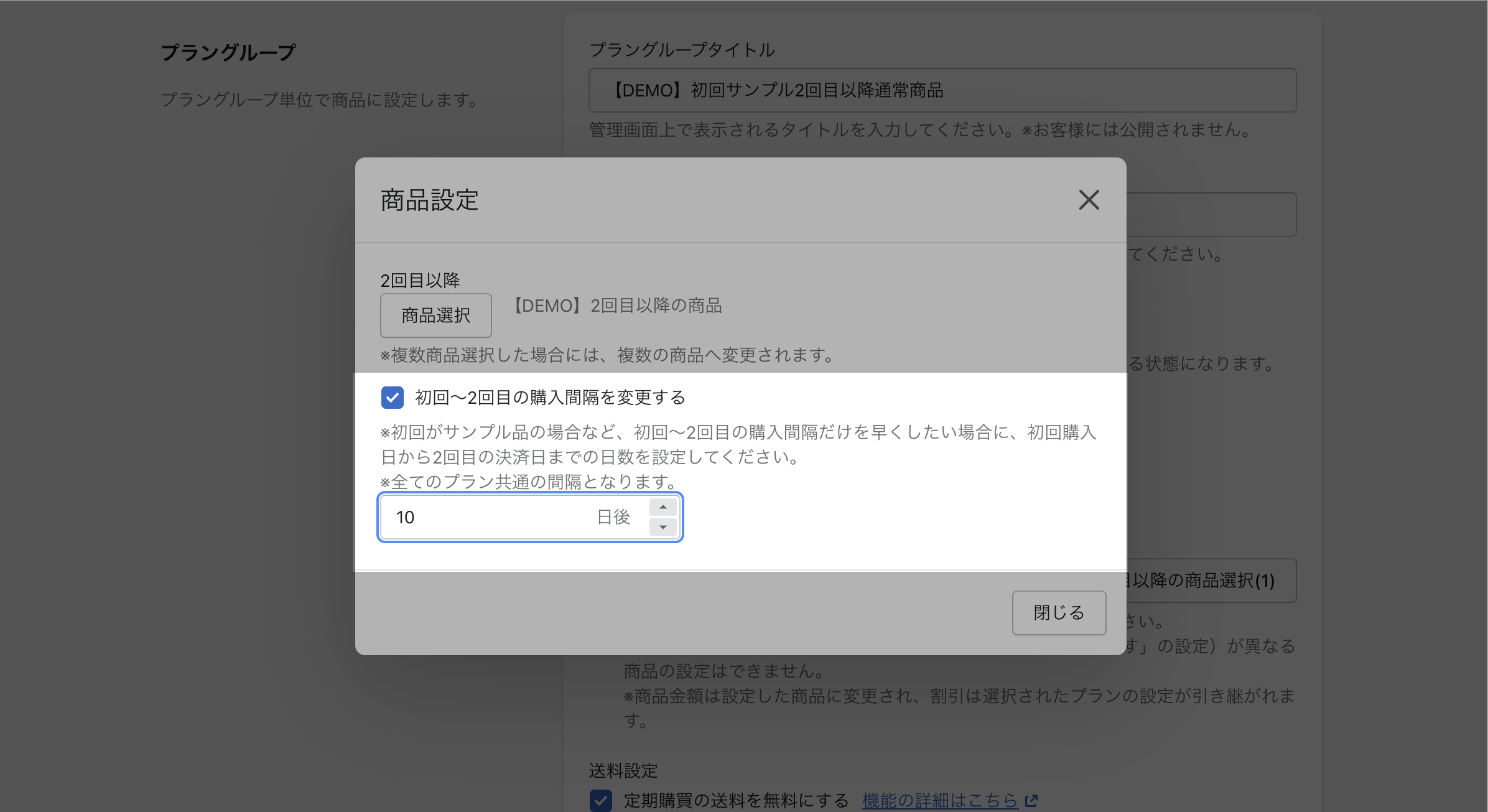 初回〜2回目の購入間隔だけを通常の購入間隔よりも早くしたい場合には、 「初回〜2回目の購入間隔を変更する」にチェックを入れ、初回購入日から2回目の決済日までの日数を入力