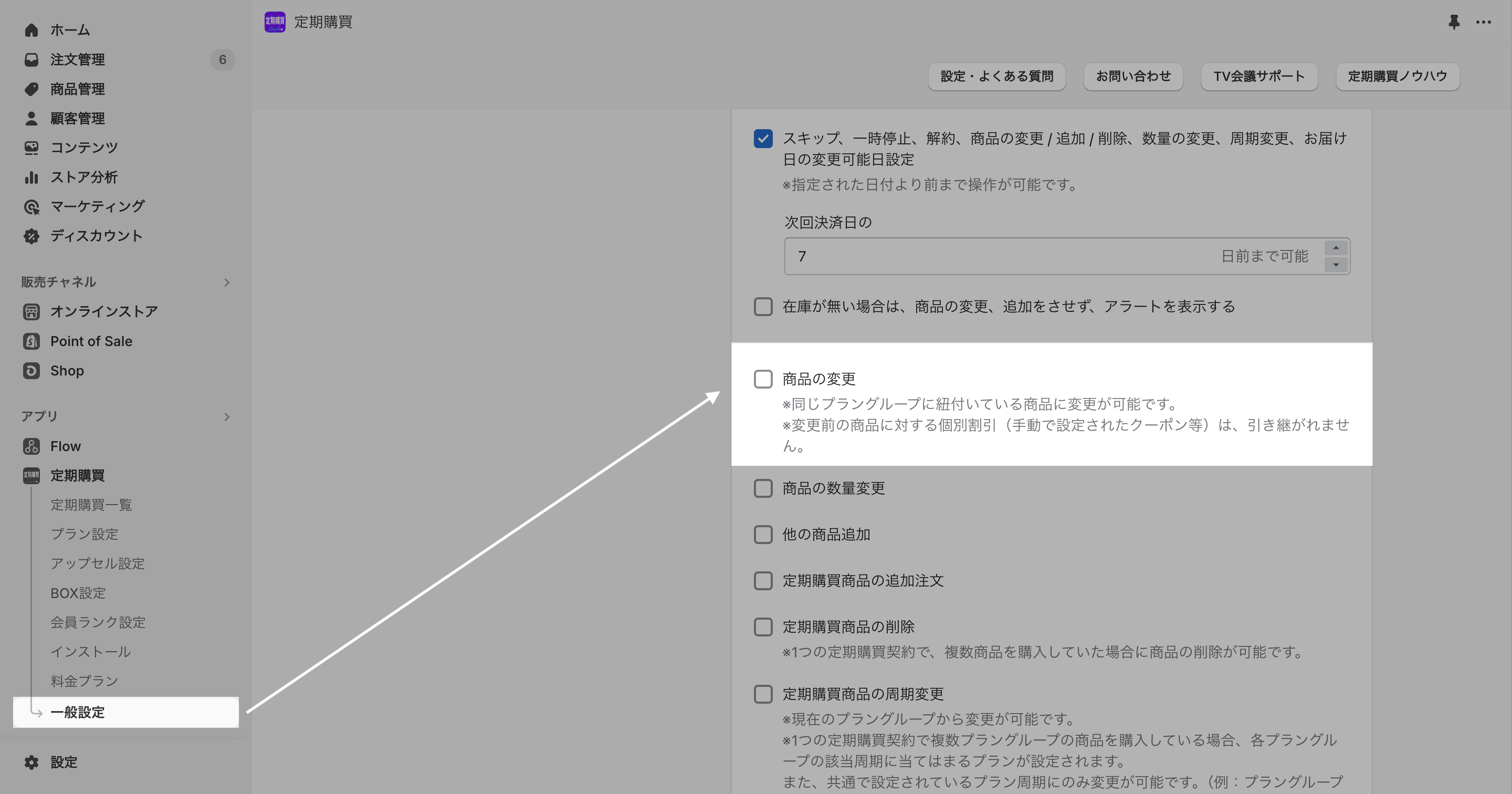 左メニューの「一般設定」より「商品の変更」のチェックを外し、顧客がマイページから初回サンプル商品を再度選択して購入しないよう設定しておく