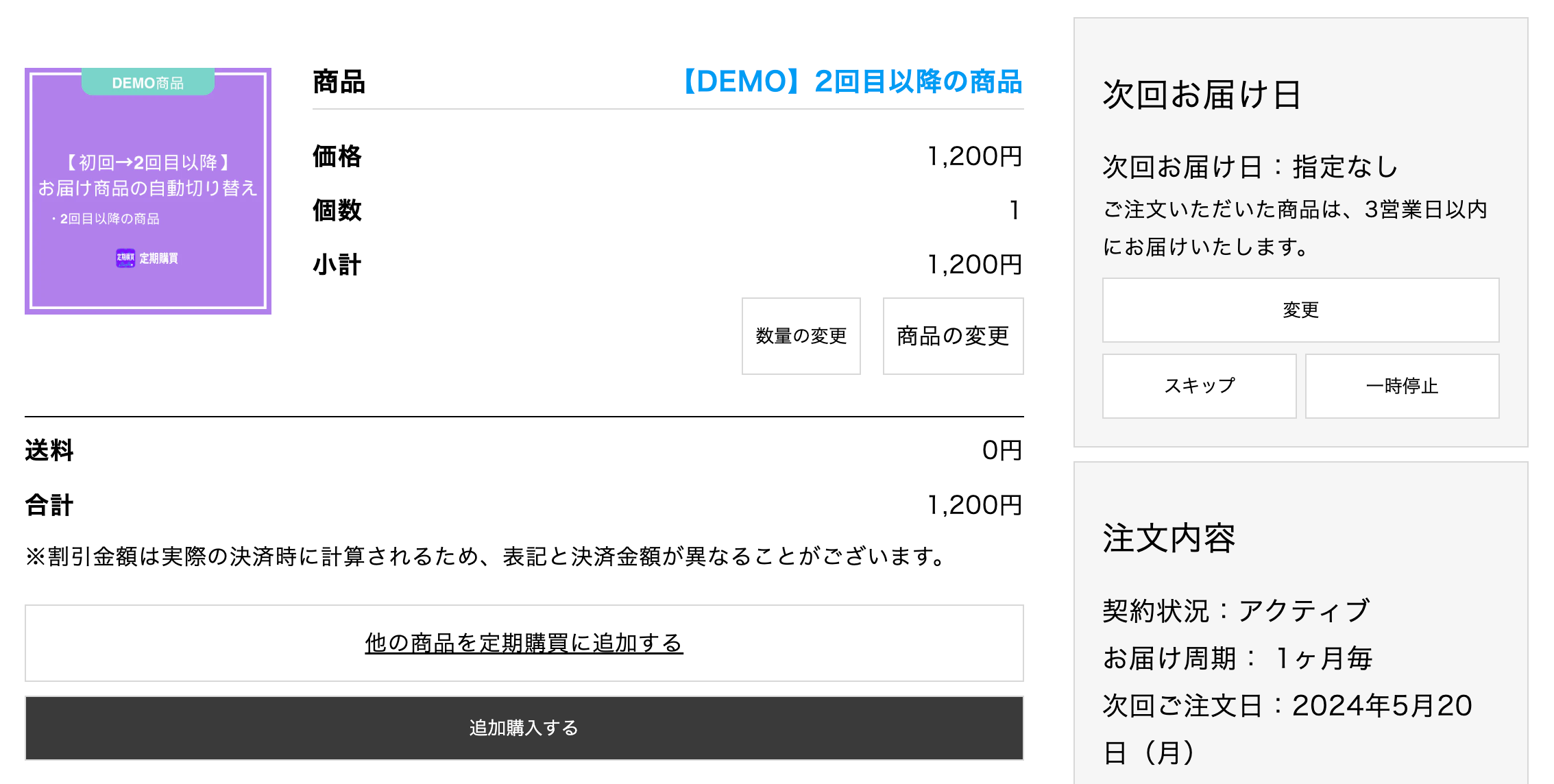 2回目以降の商品の金額は反映されません。「定期小計」部分の変更方法については、以下をご参照下さい。【2回目以降商品の自動差し替え(サンプル)機能】や【最高購入回数機能】をご利用時に、チェックアウトページで正しい金額・周期を反映させるには?