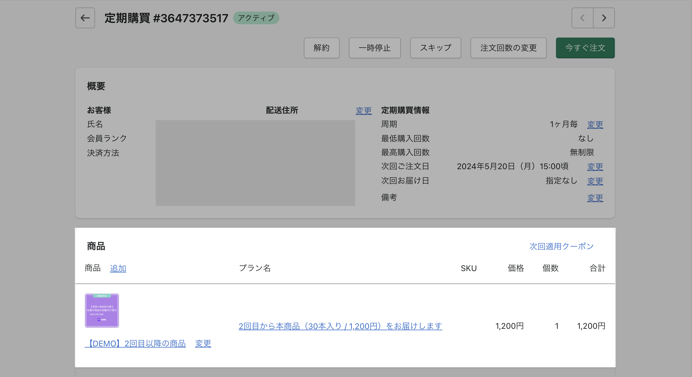 定期契約作成後、ストア管理画面上の定期契約にも次回の注文内容(2回目以降購入用の商品)が表示されるようになります。