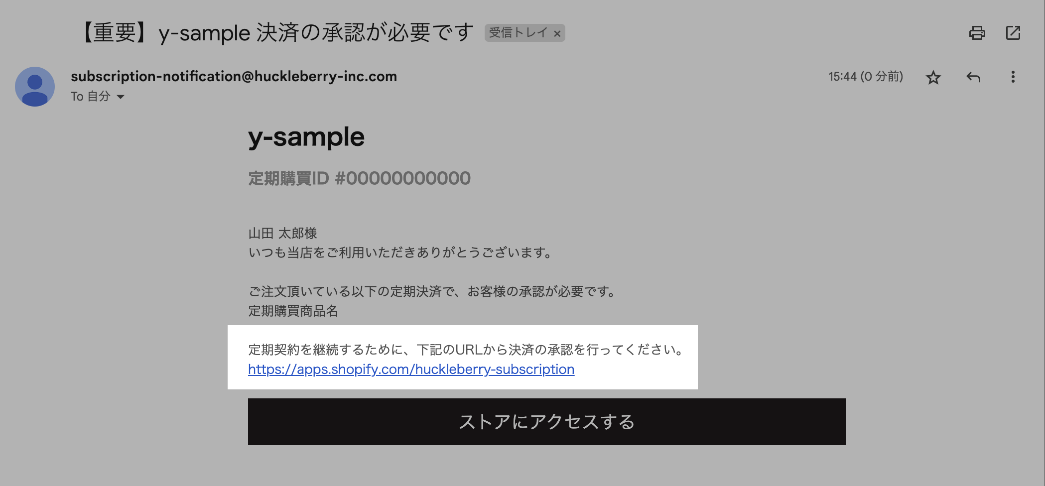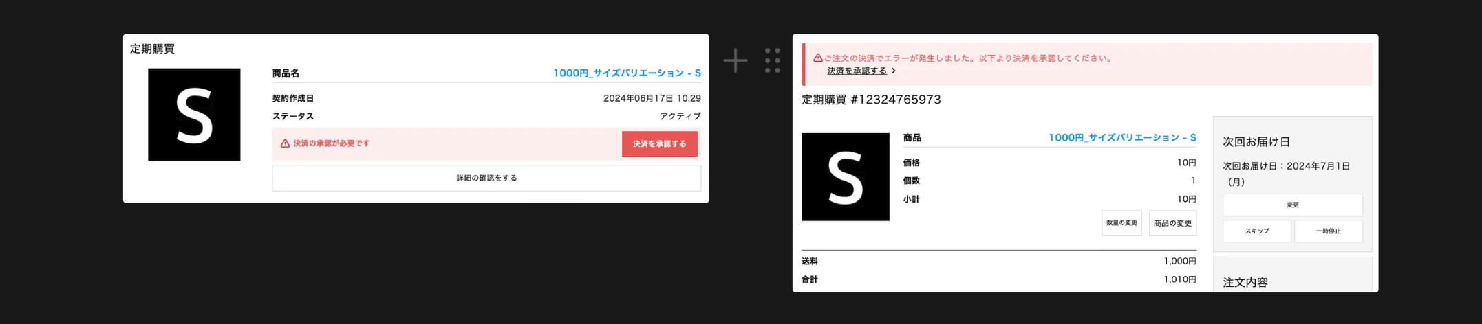 上記設定がOFFの場合、お客様へ決済の承認依頼のメールは届きませんが、定期購買マイページを開いた際に、承認を促す警告が表示されます。そこから決済の承認を行っていただくようご案内ください。