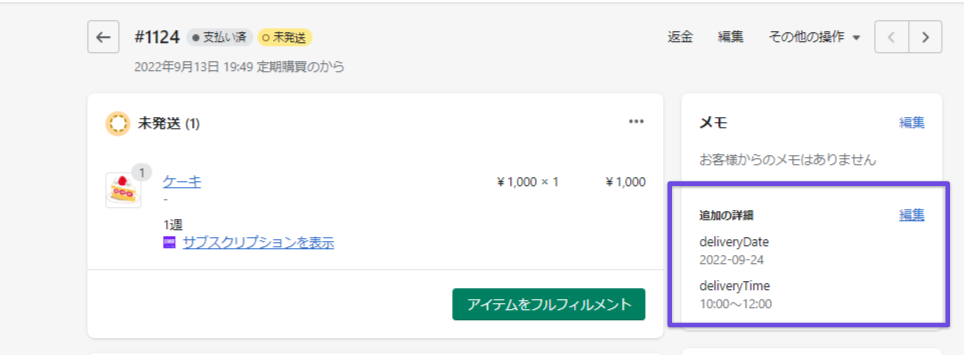 「追加の詳細」に表示されるお届け日のフォーマットはデフォルトで「yyyy-mm-dd」が適用されています。(例:2022-09-13)