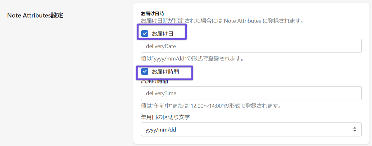 お届け日時、決済回数ともに、初回注文のNoteAttributesには反映されません。(2回目以降の注文から反映されます。)