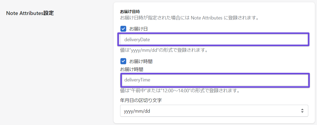 「追加の詳細」のお届け日時の表示箇所には、デフォルトで「deliveryDate」、「deliveryTime」という項目名が付与されています。